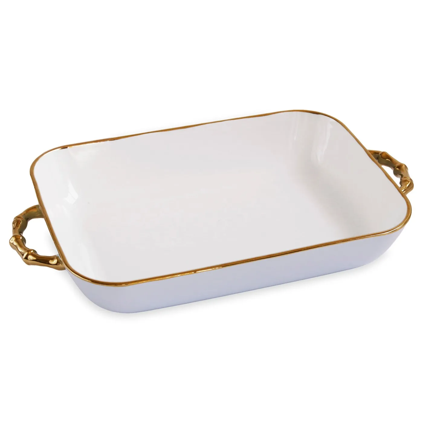 Oven-to-table elegance. The CERAMIC Bambu Rectangular Casserole in periwinkle & white is crafted in durable porcelain and accented with bamboo-shaped handles in gleaming titanium gold. Ideal for baking casseroles, roasting vegetables, or serving family favorites in style.