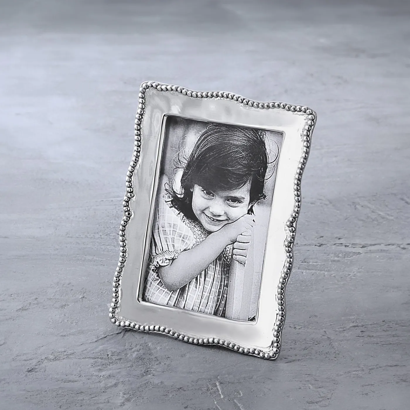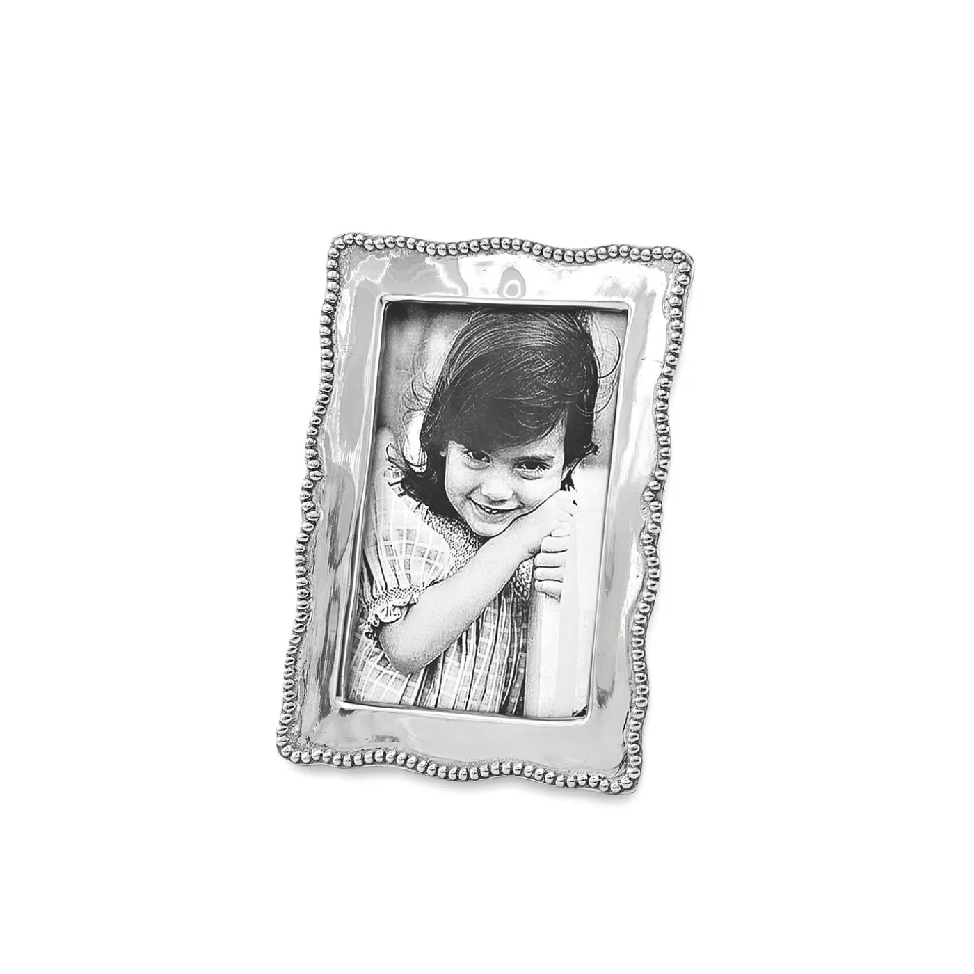 Gentle curves and pearl detailing distinguish Beatriz Ball’s GIFTABLES Pearl Denisse 4″ x 6″ Frame. From our GIFTABLES Collection featuring handmade and artfully designed Beatriz Ball items at irresistible prices. Packaged in a lovely gift box, you’ll love this handsome frame in one of our bestselling styles. Makes a luxurious gift for any occasion. Carefully hand-polished surface enhances your favorite 4×6 inch vertical or horizontal photo, and makes a stunning statement when displayed on the mantle, desk, or shelf. Makes a fine wedding gift, and the ideal solution whenever a silver frame is called for. Sand-cast and hand-polished, handmade of an aluminum alloy. Tarnish free.