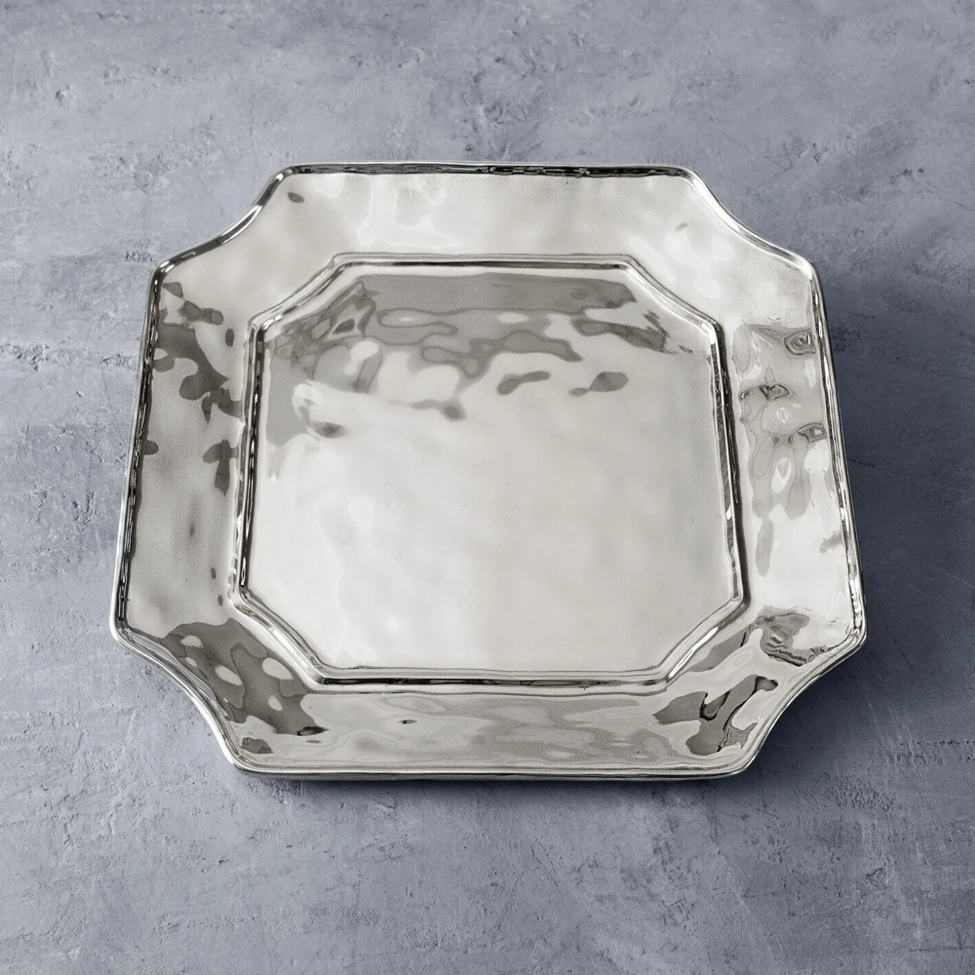 Think elegantly simple classic forms, distilled to the essential, enhanced with lively hand-polished surfaces, and that’s Lucca! Beatriz Ball revisits classicism—with a contemporary twist–in her new Lucca Collection, part of the popular SOHO Collection. The striking Lucca Square Platter is distinguished by a gleaming hammered surface, notched corners, and a gently raised border. It is a form that fits seamlessly with the brand’s handmade aesthetic, and blends perfectly with today’s trends for casual décor and entertaining. This stunning SOHO Lucca Square Platter is as handsome as it is versatile and can be used to serve a variety of foods. Pair with other Lucca pieces or other designs for a striking curated tablescape. An original design by Beatriz Ball, handmade of a top quality, FDA safe, easy-care, oven and freezer friendly aluminum alloy.