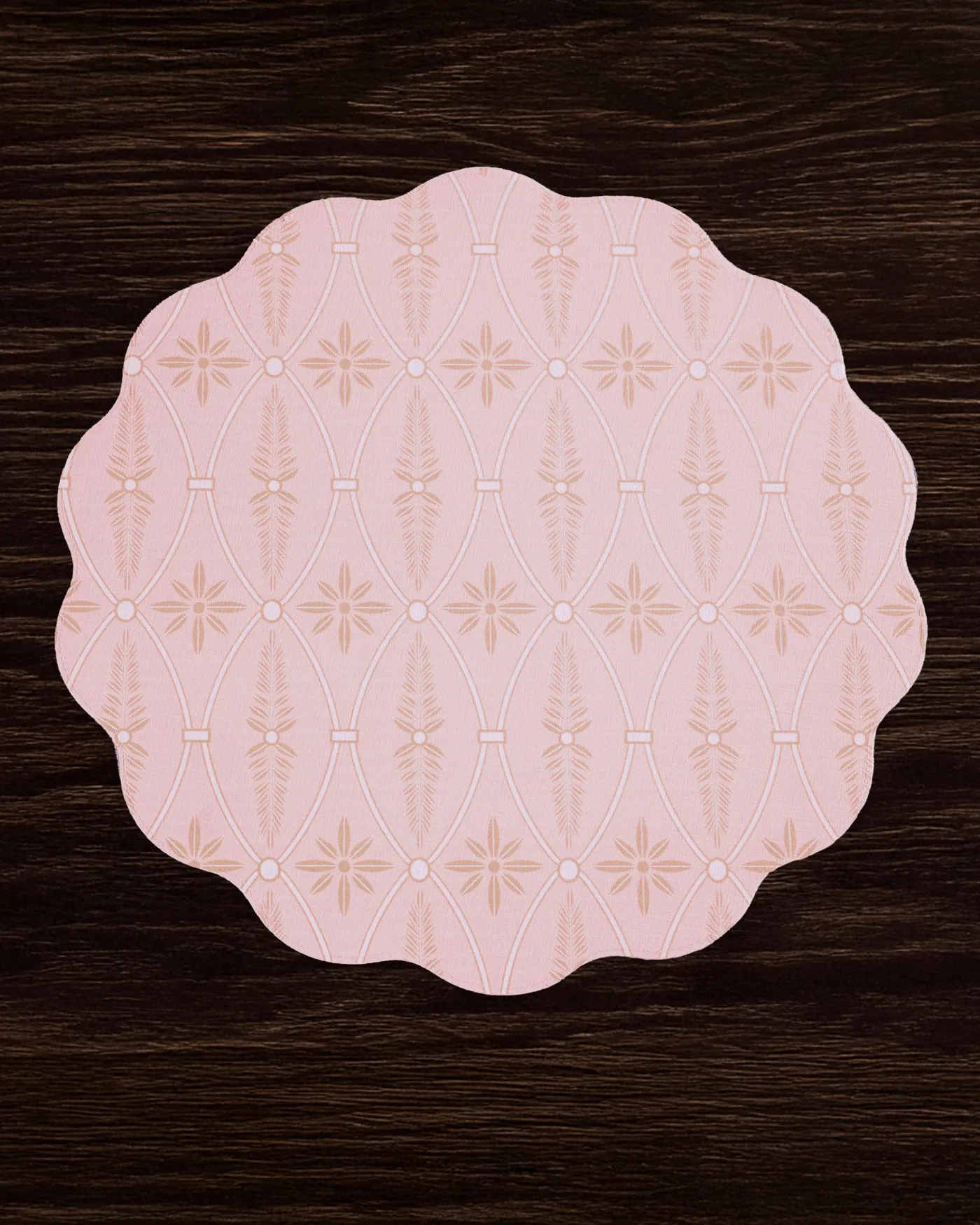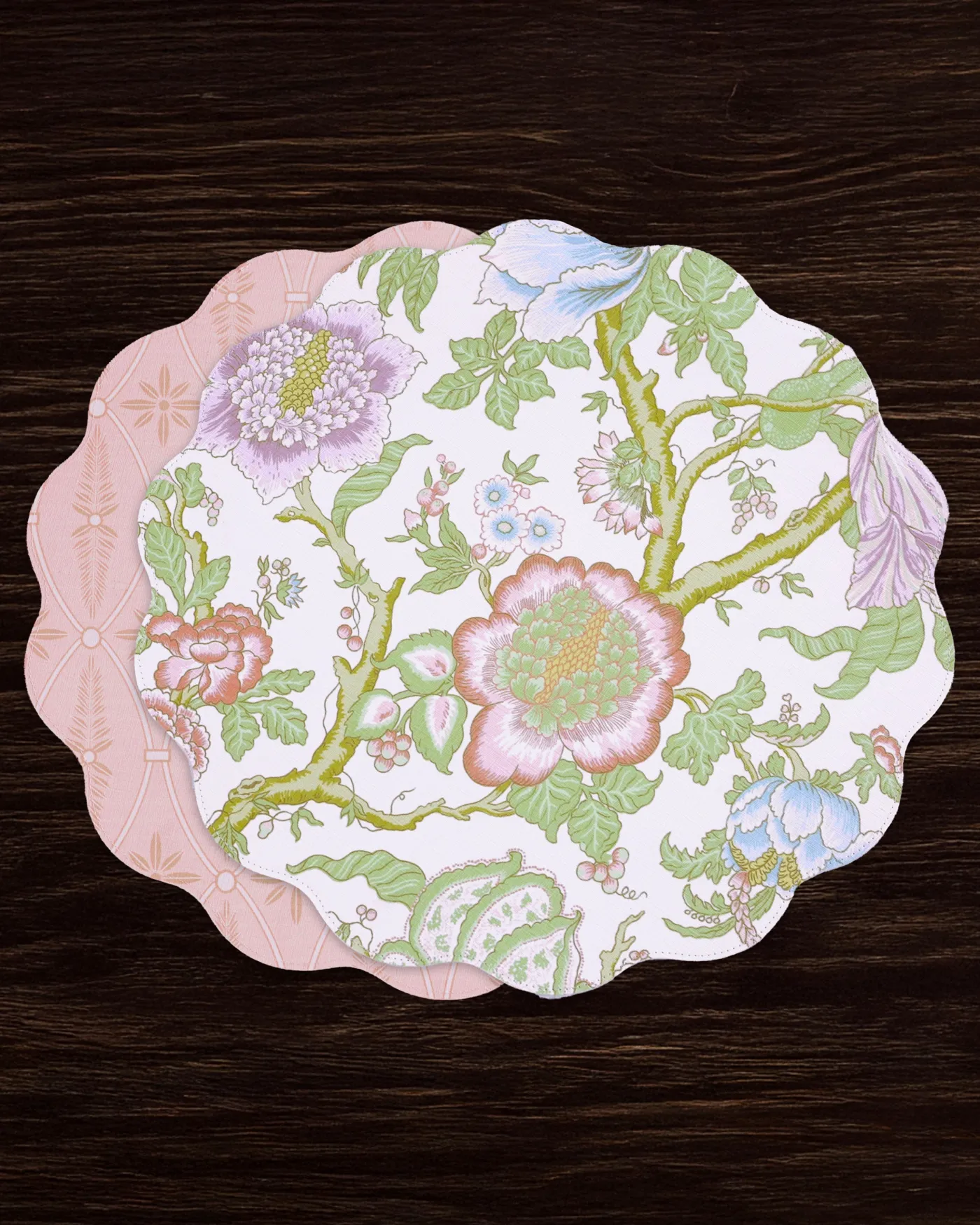 Fresh color and timeless style. Sold in sets of four, the VIDA Blooms & Branches Reversible Round Placemats in pastel pink & blue have a supple leather-like feel and linen texture. One side features a classic Jacobean motif; the reverse shows a stylized floral in complementary pastel tones.