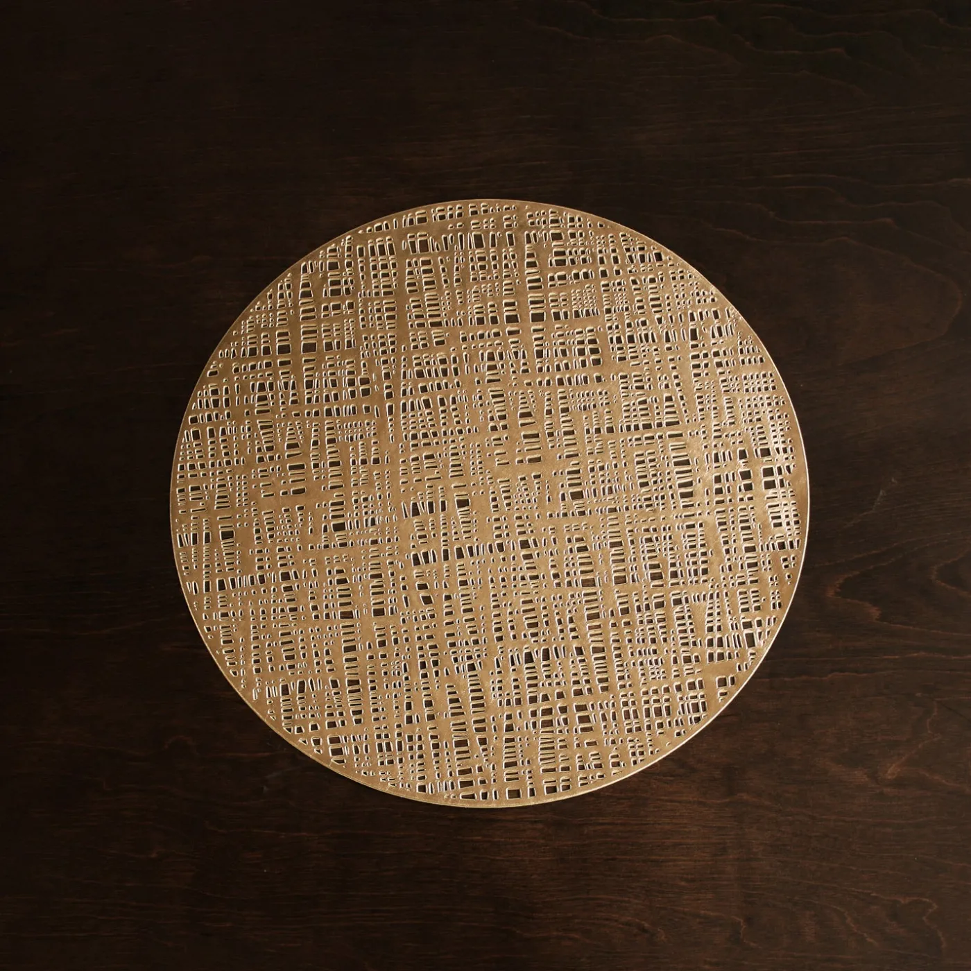 Next level style in a richly textured Woven pattern.Raise your table setting to the next level of style and sophistication with our metallic, non-stick vinyl placemats offered in four chic designs. The VIDA Woven 15″ Round Placemats Set of 4 (Gold) is an ideal accent for dinner parties, weddings, or other festive events. Resilient vinyl construction makes these mats durable and fun tabletop accents. Add dimension and shimmer to your event with these modern mats that can be used as chargers for your dinnerware, placed under your centerpiece as an elegant base, or to stage decorative accessories. Easy Care: Hand wash in warm soapy water, wipe dry. No machine wash.