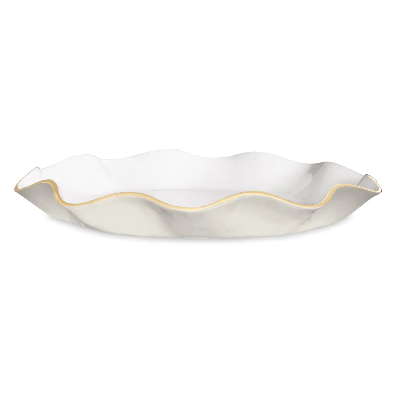 Notable for its flirty curves, generous serving area, and brilliant two-tone finish rimmed in gold, the ENCANTO Carola Large Round Platter (Cream and White) is as practical as it is decorative. Presented in Cream and White, a versatile neutral associated with luxury, elegance, and calm sophistication. I Ideal for the coffee table, the bar, or the kitchen island. Use for appetizers, desserts, meat, salad or for display.