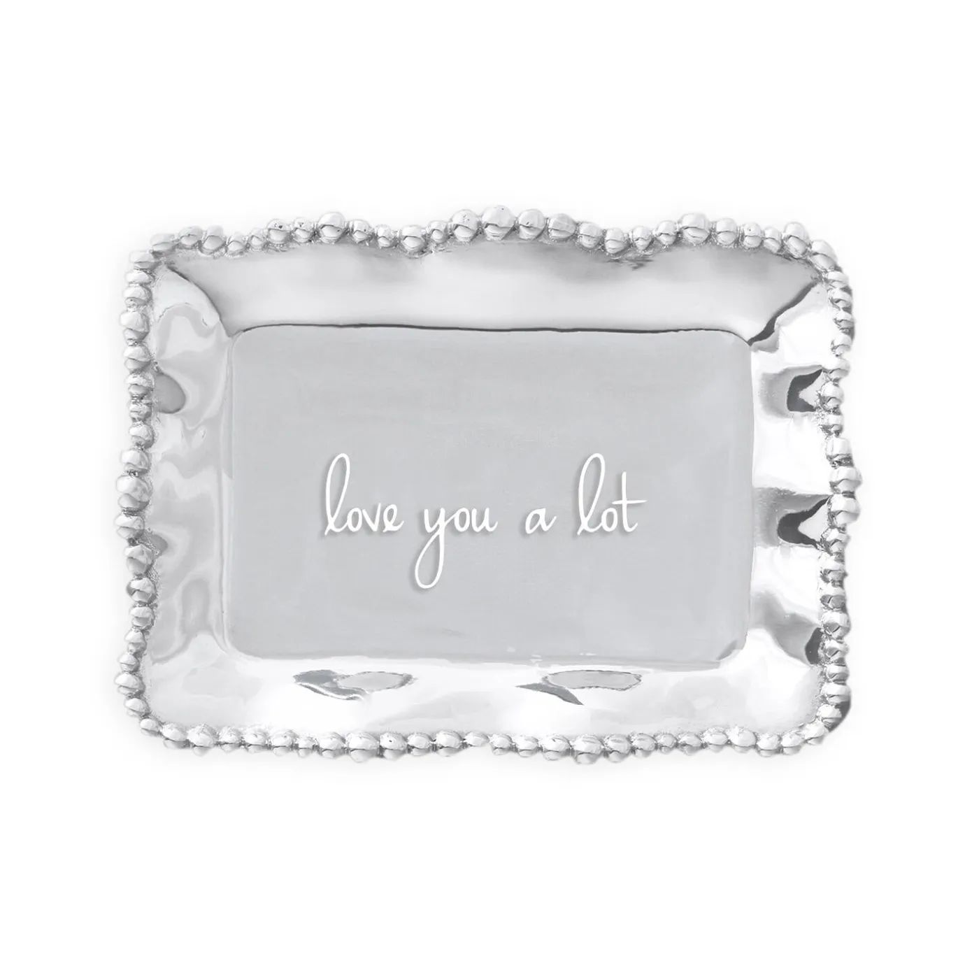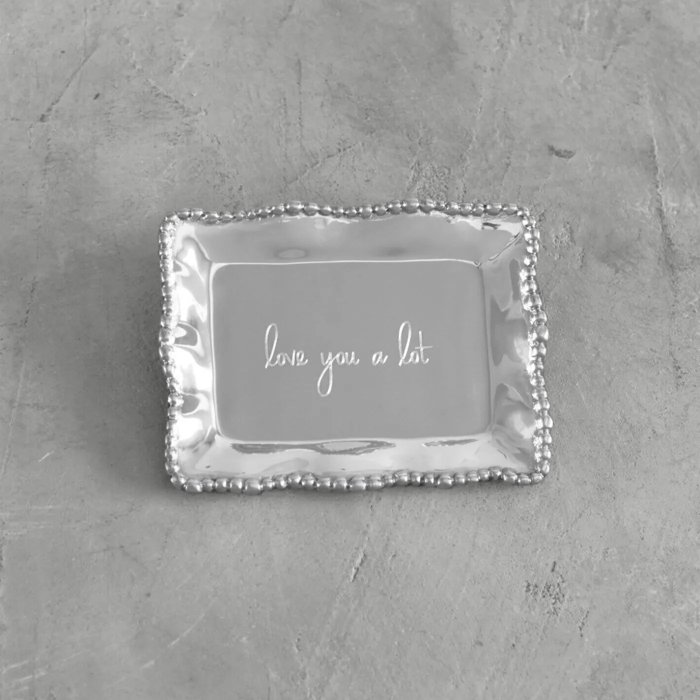 Engraved with the slogan, “love you a lot,” this delightful mini tray is distinguished by its rich, hand finished surface, and practical size.