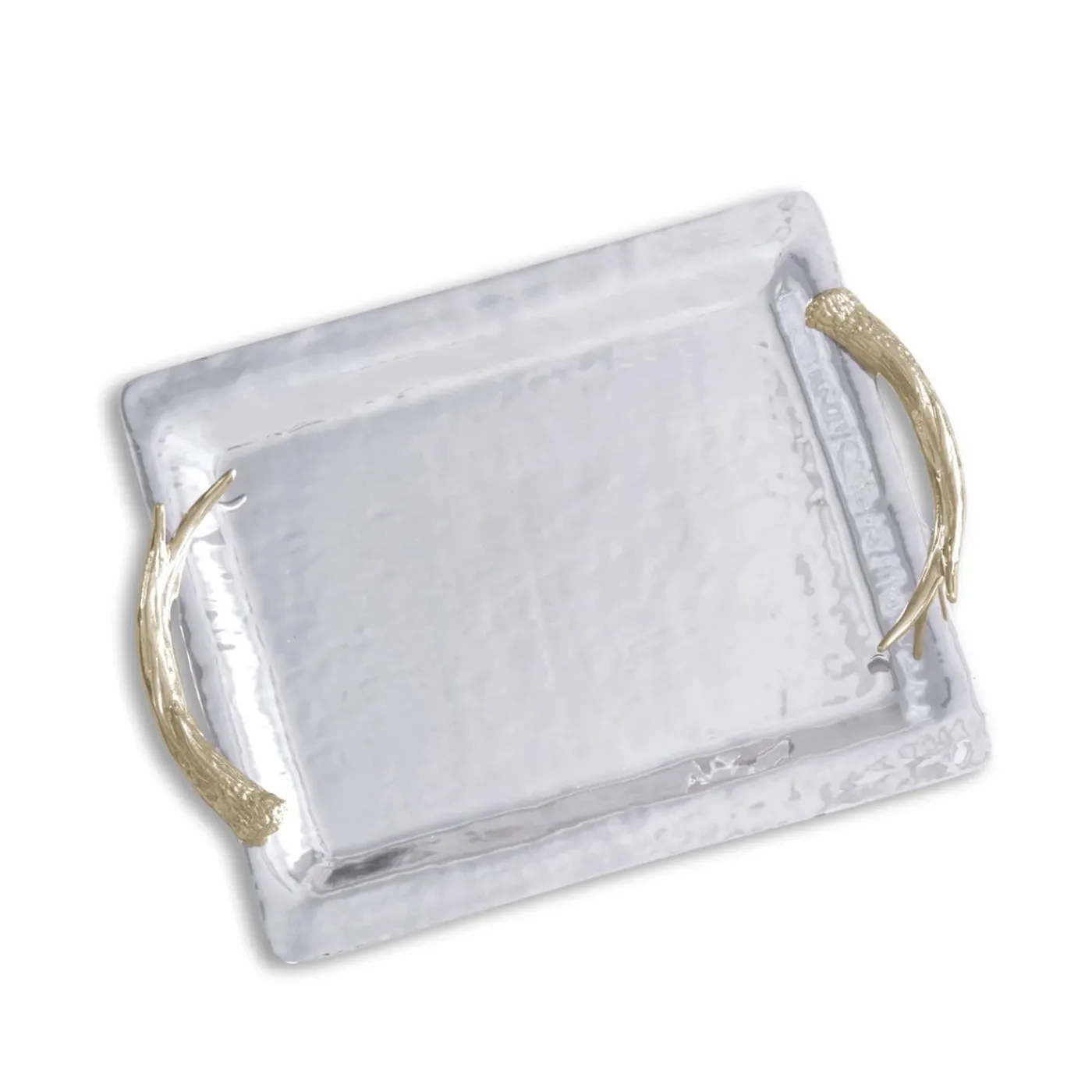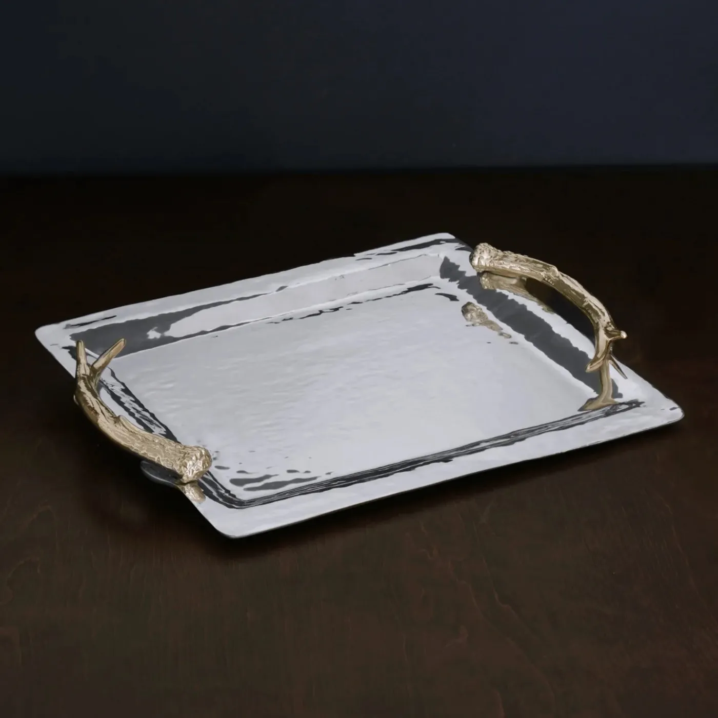 Realistic antler handles in a prorietary gold-tone finish stand out against the polished silvery tray. Designer Beatriz Ball says of the shimmering quality of the surface, “Love this cool new finish, it glimmers like moonlight on water.” This glimmering, shimmering tray is designed for sharing. The Beatriz Ball WESTERN Antler Emerson Large Tray with Gold Handles boasts a generous sand-cast surface that is both spectacular and functional. Great on the table, bar or ottoman, it absolutely invites sharing. Handmade by skilled artisans, this is a multipurpose tray your guests will appreciate as much for its supreme functionality as for its artistic originality. Makes an awesome gift! An original design and Beatriz Ball exclusive! Beatriz Ball’s intensely handmade products use eco-friendly and sustainable materials and are crafted by artisans who trace a heritage of metalworking for generations. Made of a top quality, FDA safe, easy-care aluminum alloy.