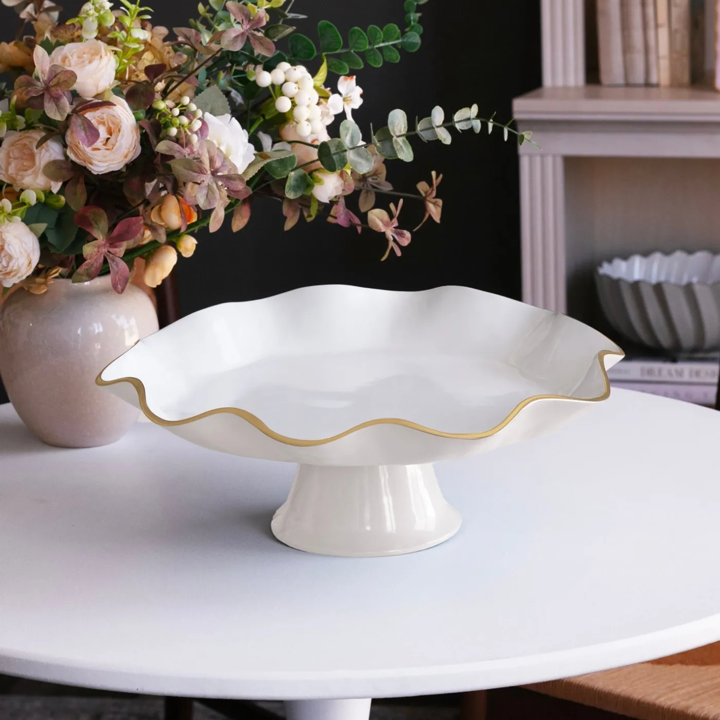 Elevate your style with the ENCANTO Carola Pedestal Cake Plate (Cream and White). Notable for its flirty curves, elegant rise, and brilliant two-tone finish rimmed in gold, this piece is as practical as it is decorative. Cream, a versatile neutral tied to luxury and elegance, evokes calm sophistication and timeless appeal.