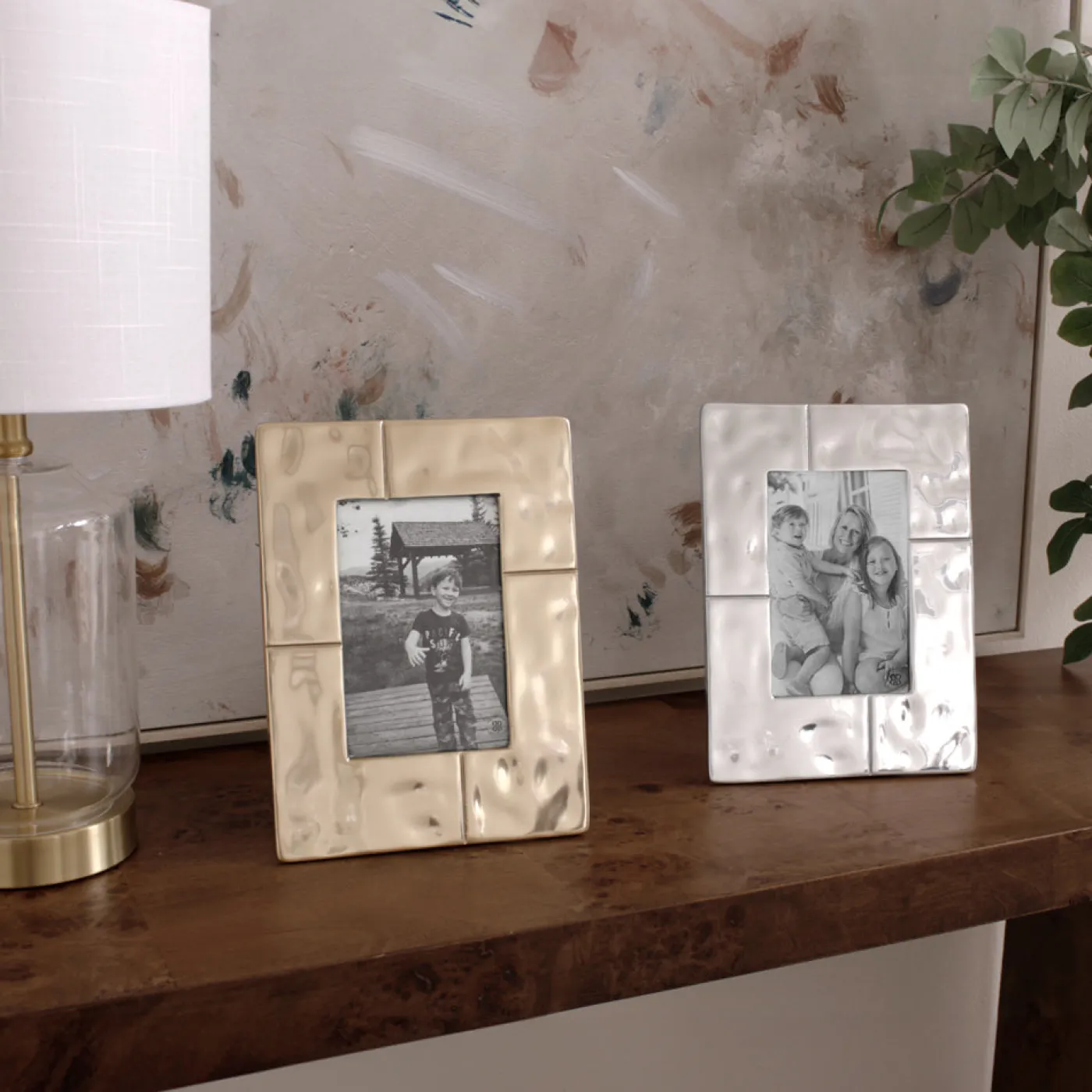Pure brilliance! With its silvery finish and asymmetrical pattern of grooves, the FRAME Asimetric 4 x 6 Vertical of polished metal enhances your favorite 4×6 vertical photo, and looks amazing when displayed on the mantle, desk, or shelf. Composed of a gleaming hand-finished silvery metal that keeps its shine and never needs polishing, the frame has been designed to stand vertically without the aid of support. The frame makes a fine wedding gift–or for any special occasion–and is an elegant solution whenever a metal frame is called for. Beatriz Ball’s intensely handmade products employ eco-friendly and sustainable materials and are crafted by artisans who trace a heritage of metalworking for generations. An original Beatriz Ball design, sustainably handmade of a top quality, easy-care, aluminum alloy. Tarnish free.