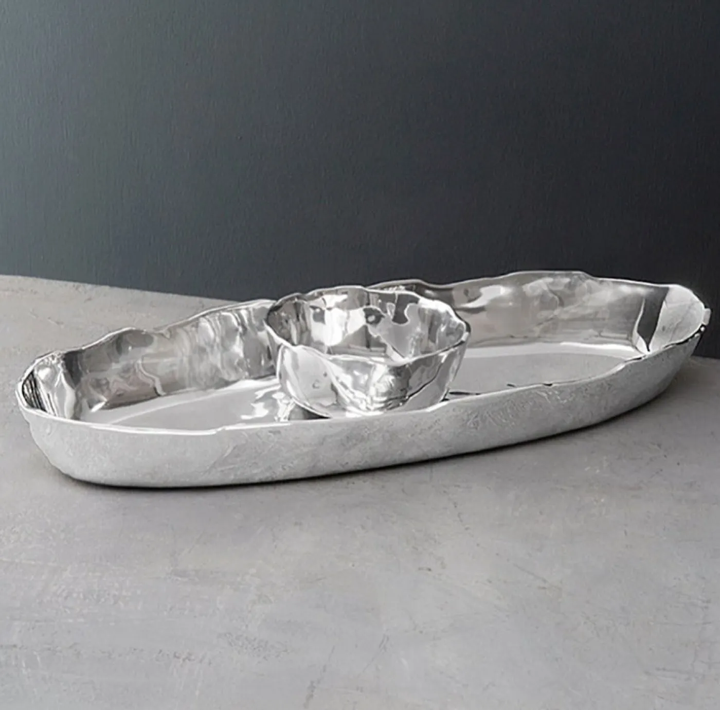 Two fabulous pieces in one fantastic design! With its compact size and rich surface details, the artisan-made SOHO Brooklyn Deep Oval Chip & Dip offers an elegant solution for small space entertaining. The striking sand-cast metal two-piece set offers timeless Beatriz Ball design, elegant practicality, and modern styling perfectly attuned to the good life. With its removable dip bowl, this stylish and versatile piece is ideal for serving fresh fruit, veggies, and crackers with your favorite dips and spreads. A multifunctional investment piece of heirloom quality. An original Beatriz Ball design handmade of an FDA safe, easy-care, oven and freezer friendly aluminum alloy. Tarnish free.