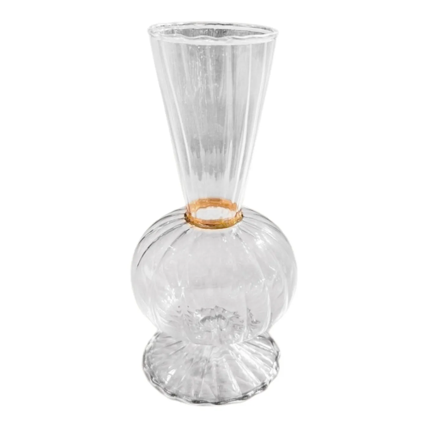 Perfectly clear! Beatriz Ball celebrates the glassmaker’s art with the luxurious GLASS Cambridge Collection. Delightfully designed in clear glass, our GLASS Cambridge Beth 6″ Bud Vase Set of 2 (Clear) features a fluted globular form sitting atop a lively raised base. A dramatic conical neck finishes the piece. Simply stunning with hand-painted gold accents. A great new addition to your home, the vases are sold as a set of two. Made exclusively for Beatriz Ball. Handwash.