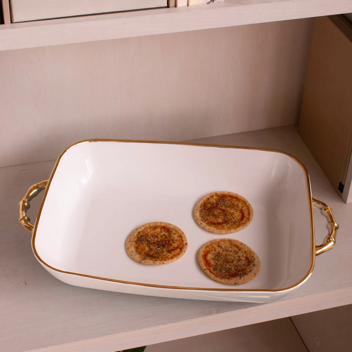 Classic style with modern ease. The CERAMIC Bambu Rectangular Casserole in cream & white is crafted in durable porcelain and finished with bamboo-shaped handles in gleaming titanium gold. Perfect for baking casseroles, roasting vegetables, or presenting entrees straight from oven to table.