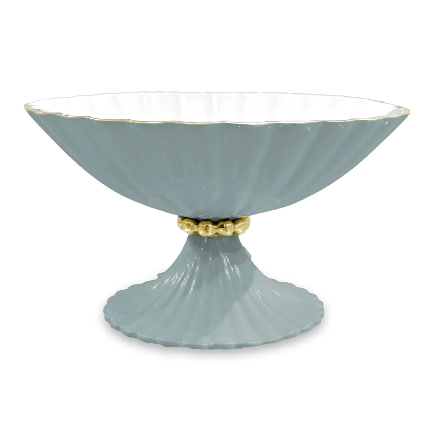 A refined look with vintage-inspired accents. The ENCANTO Vienna Small Pedestal in Slate and White pairs timeless detailing with a soothing, modern color story. Fluted surfaces, pearl accents, and a lustrous gold rim give this piece elevated versatility, whether used to serve cakes and savory bites or styled as a centerpiece with flowers.