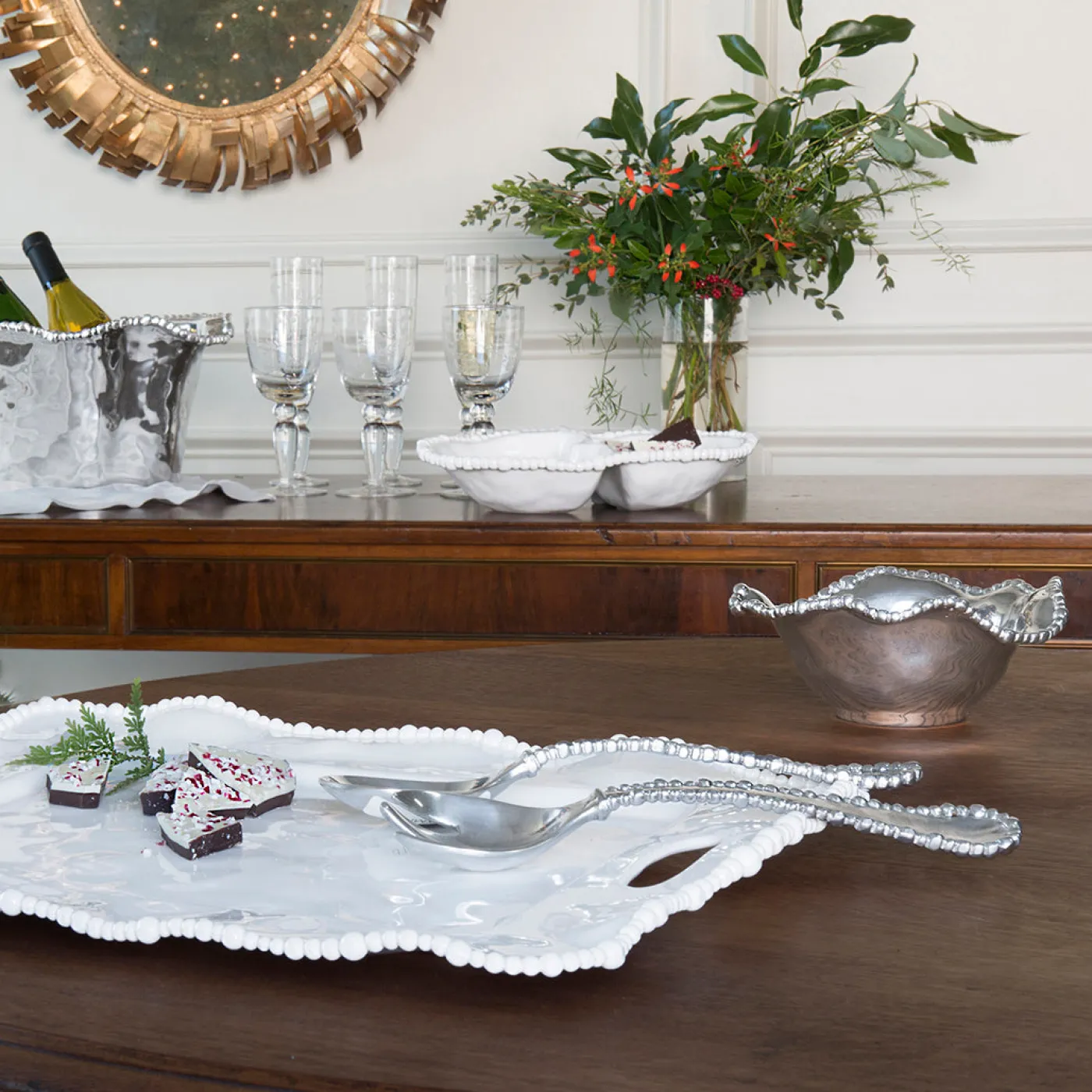 Made of decorative metal with the look of silver, it is great for serving sauces, gravies, hot dips, and salsas with characteristic Beatriz Ball panache.