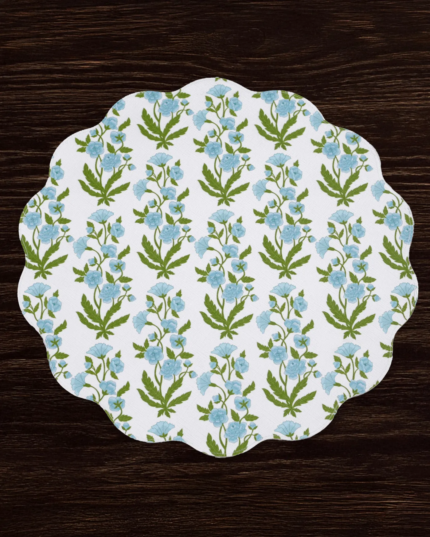 Double the options. Sold in sets of four, the VIDA Blooms & Branches Reversible Round Placemats in teal & green have a supple leather-like feel and linen texture. One side features a classic Jacobean design; the reverse shows a stylized floral pattern in coordinating teal and green tones.