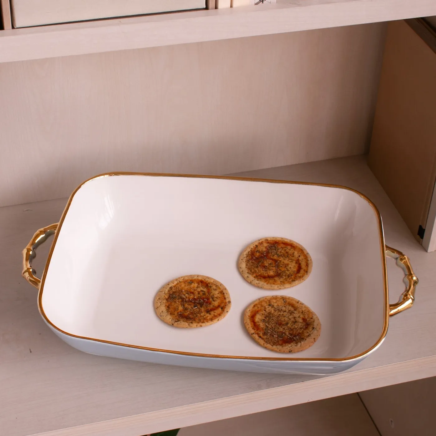 Oven-to-table elegance. The CERAMIC Bambu Rectangular Casserole in periwinkle & white is crafted in durable porcelain and accented with bamboo-shaped handles in gleaming titanium gold. Ideal for baking casseroles, roasting vegetables, or serving family favorites in style.