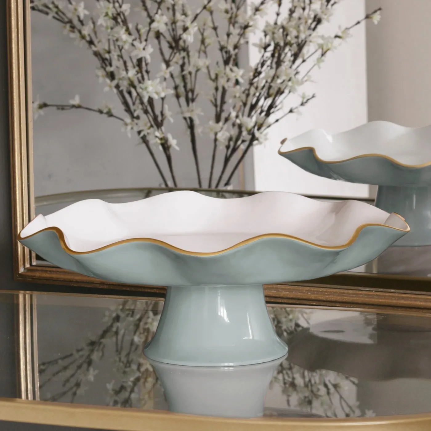 Elevate your style with the ENCANTO Carola Pedestal Cake Plate (Slate and White). With flirty curves, elegant rise, and a gleaming two-tone finish accented by gold, it makes a statement while remaining highly functional. Slate, a calm neutral blue, offers timeless versatility and a sophisticated modern edge.