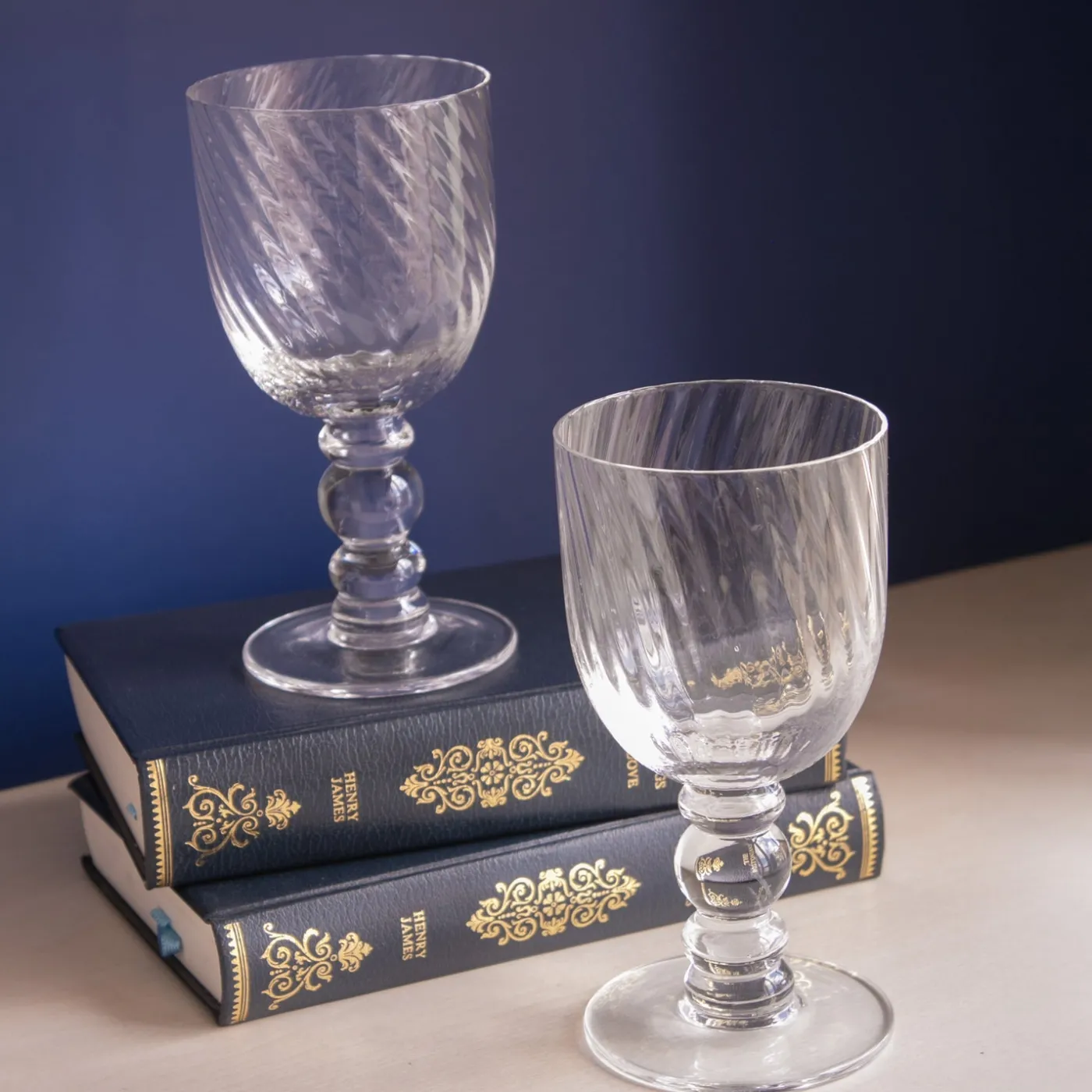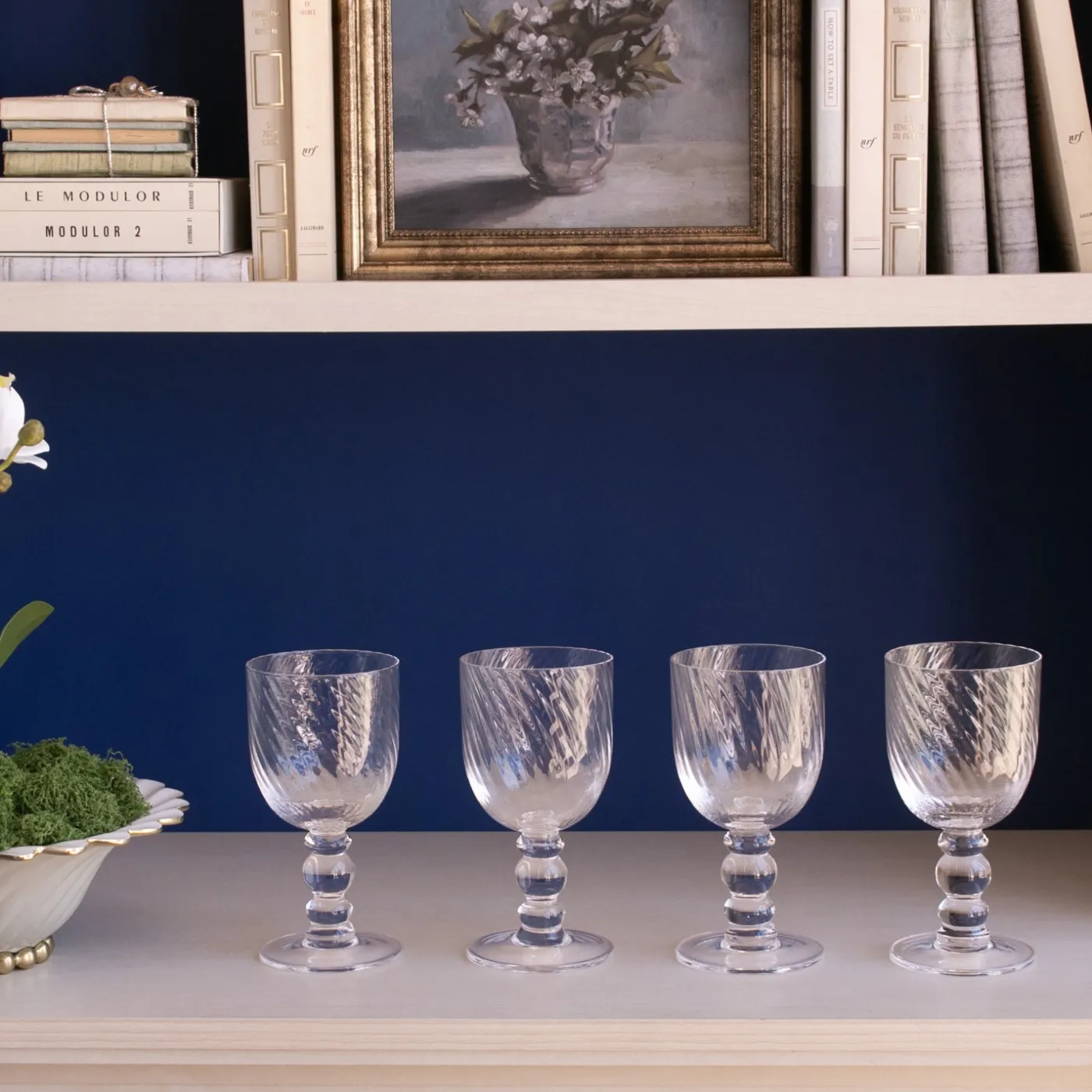 Perfectly clear and timelessly elegant, the French Swirl Wineglasses in a set of 4 (Clear) showcases a swirl optic bowl and gracefully curved stem that catch and reflect the light. The design gives the impression of woven lines and shimmering reflections, making every pour a celebration.