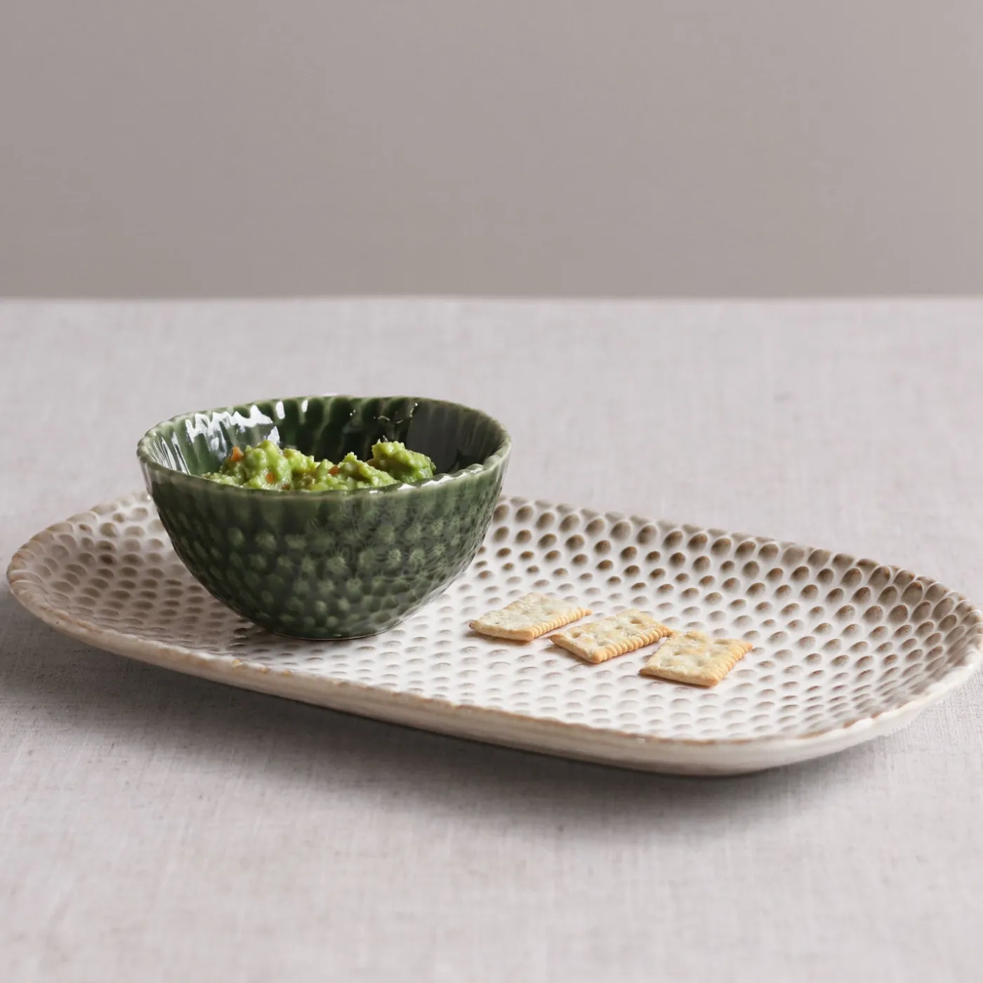 “Take a dip!” Using one-at-a-time hand glazing techniques meticulously performed by the most skilled artisans of Portugal, our new Allegra, Aurora, Chiara, and Valentina ceramic items showcase a lively interplay of color and surface irregularities that guarantees their uniqueness. CERAMIC Aurora Dip Bowl Set of 2 (Green) is a perfect example, and proof that no two pieces are ever alike. Enlivened with a textured and patterned surface, its richly irregular appearance spotlights the art of hand glazing, while its form demonstrates the timeless appeal and durability of fired stoneware. Designed to mix and match, pair with the CERAMIC Aurora Rectangular Platter (Dusty White) for a colorful serving set. Ideal for snacks and dips. Sold as a set of two, the stoneware pieces are handmade and skillfully glazed. A bowl for all seasons–including the Holidays. Microwave, dishwasher and oven safe up to 350 degrees.