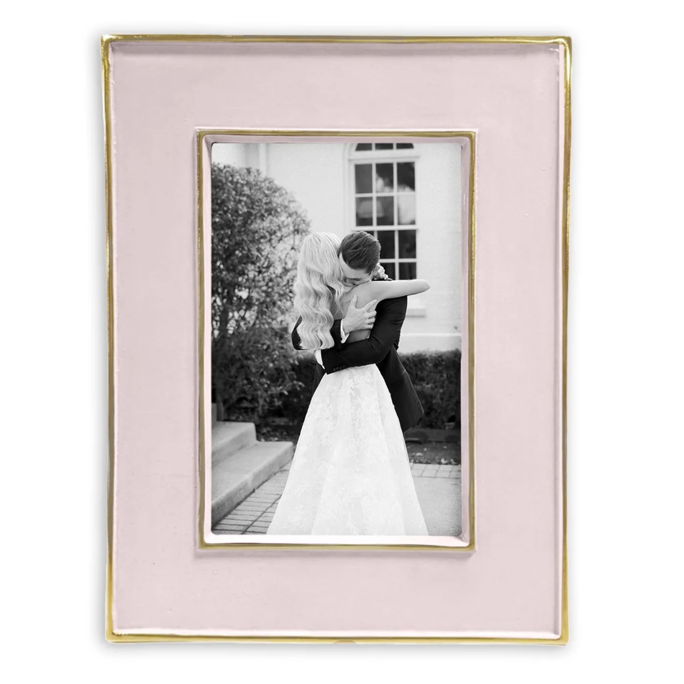 Fabulous design in Camellia. The Encanto Jason Frame, 4 x 6 Wide (Camellia) features a bold rectangular border in enamel with radiant gold accents. Perfect for a 4×6 photo, it blends sophistication with warmth. The Camellia shade, a delicate blush pink, softens any interior with romance and refinement. A superb gift for brides, bridal registries, weddings, or new homeowners.
