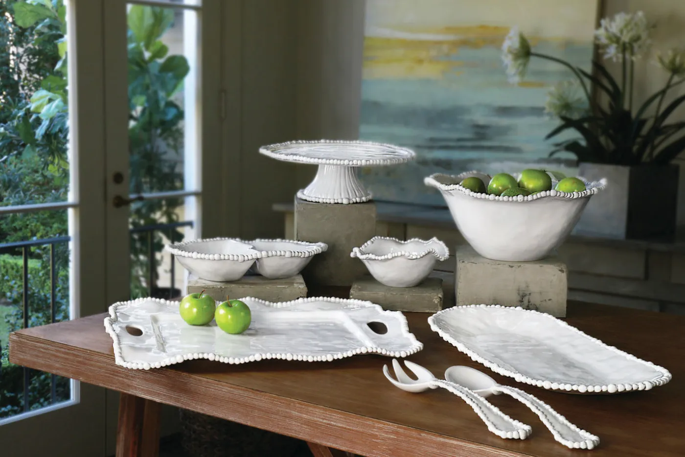 Melamine, reinvented. A brilliant white finish and pearl-rimmed styling make the Beatriz Ball VIDA Alegria Large Salad Servers (White) the ideal choice for bowls in this collection of luxury melamine. The attractive servers are made of high quality melamine for everyday enjoyment. Perfectly suited for indoor and outdoor entertainment, Alegria is a collection as joyful as its name. Mix and match with our other melamine items for a vibrant tablescape, or pair with our large white bowl for a great salad set. Decorative servers made of luxury melamine are always appreciated, so pair them with any bowls for a great gift combo. Dishwasher safe (top rack), heavy-weight, food safe, BPA and PABA free.
