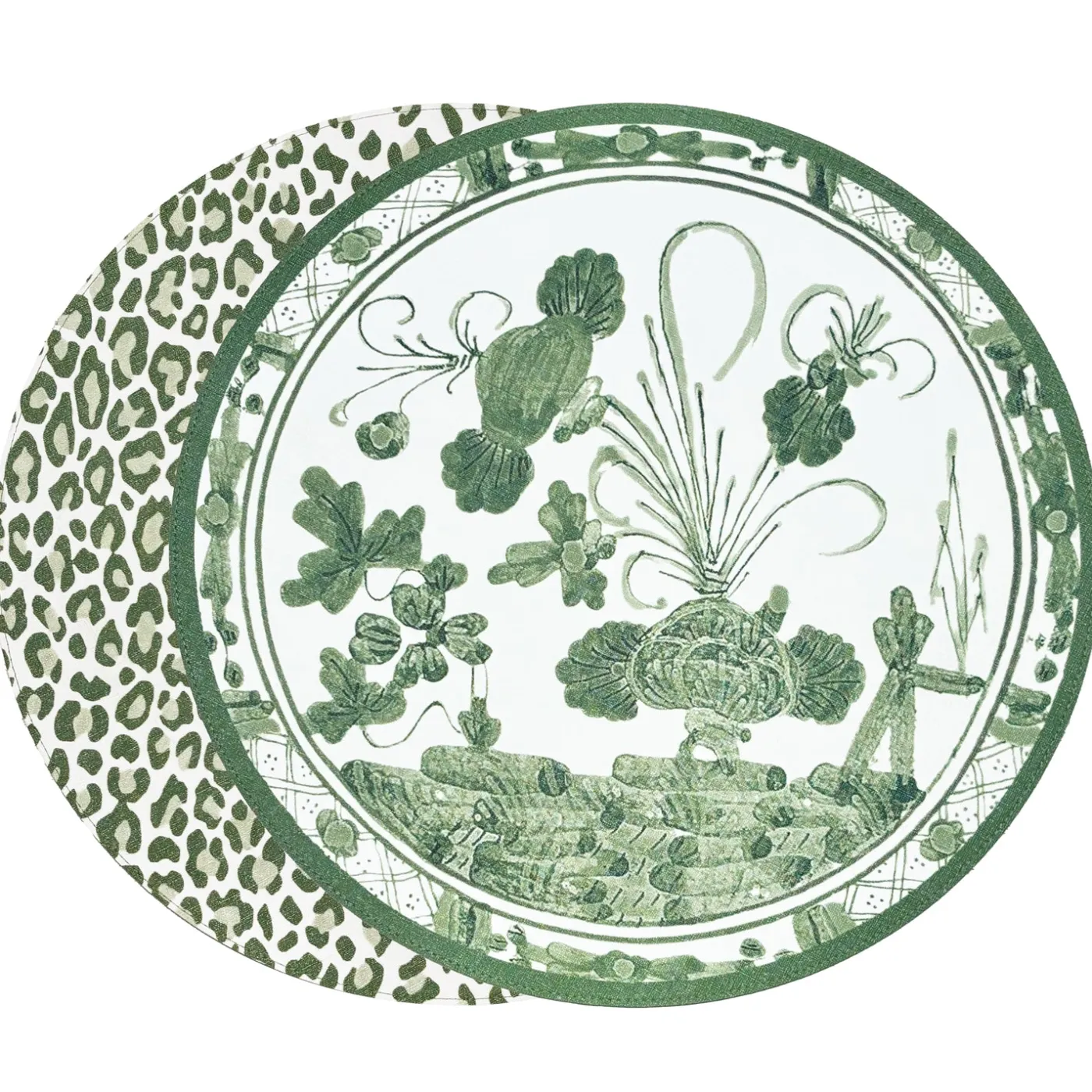Two looks in one versatile design. The VIDA Faenza & Green Reversible Round Placemats in white & green have a supple leather-like feel and linen texture. One side features a classic Faenza-inspired motif, while the reverse shows a crisp green ground for fresh table styling.
