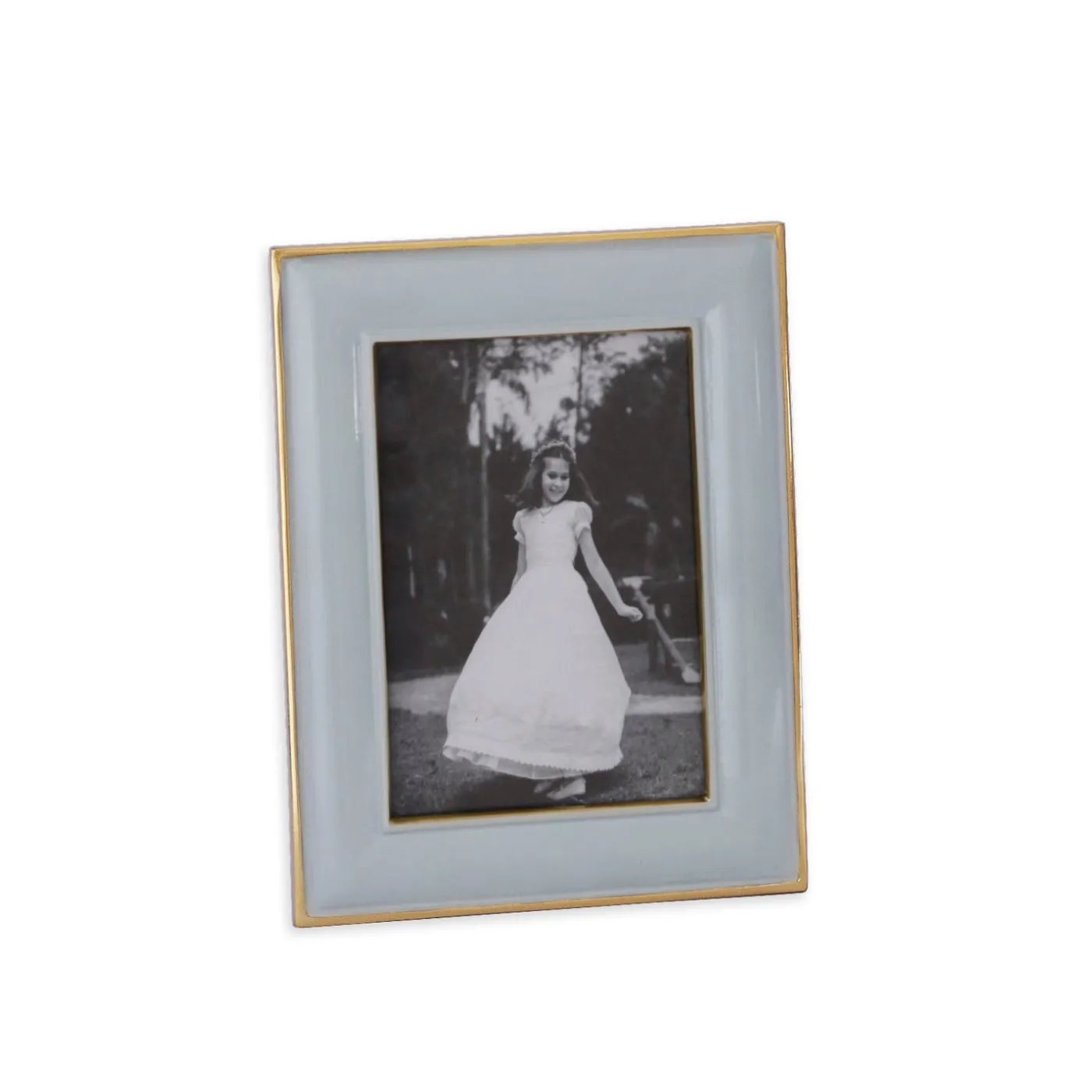 The Encanto Charlotte 4×6 Frame in slate features a sleek enamel finish with gold-tone accents and a refined silhouette; designed for vertical or horizontal display.