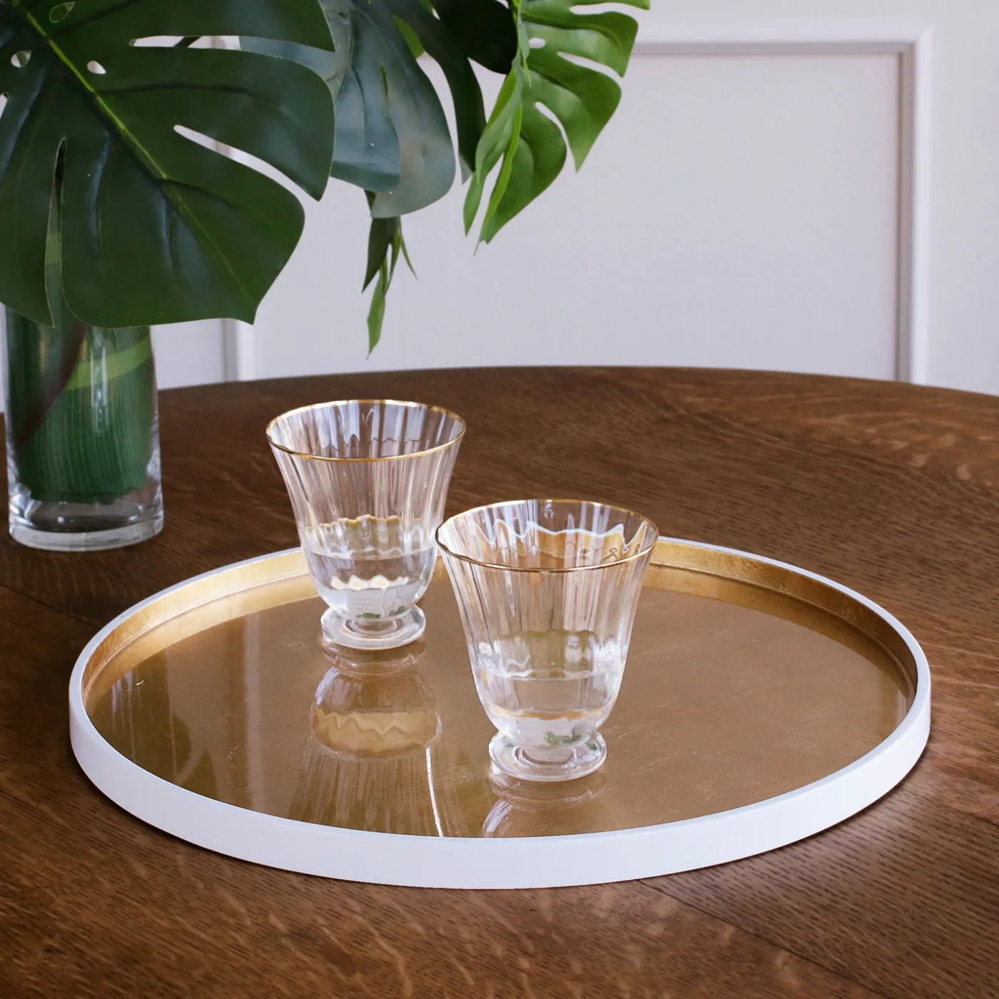 Sleek and versatile. The INDOCHINE Round Lacquered Tray in white & gold features a luminous lacquered finish accented with a radiant palm motif. Its round shape makes it ideal for serving cocktails, corralling barware, or styling candles and decorative accents.