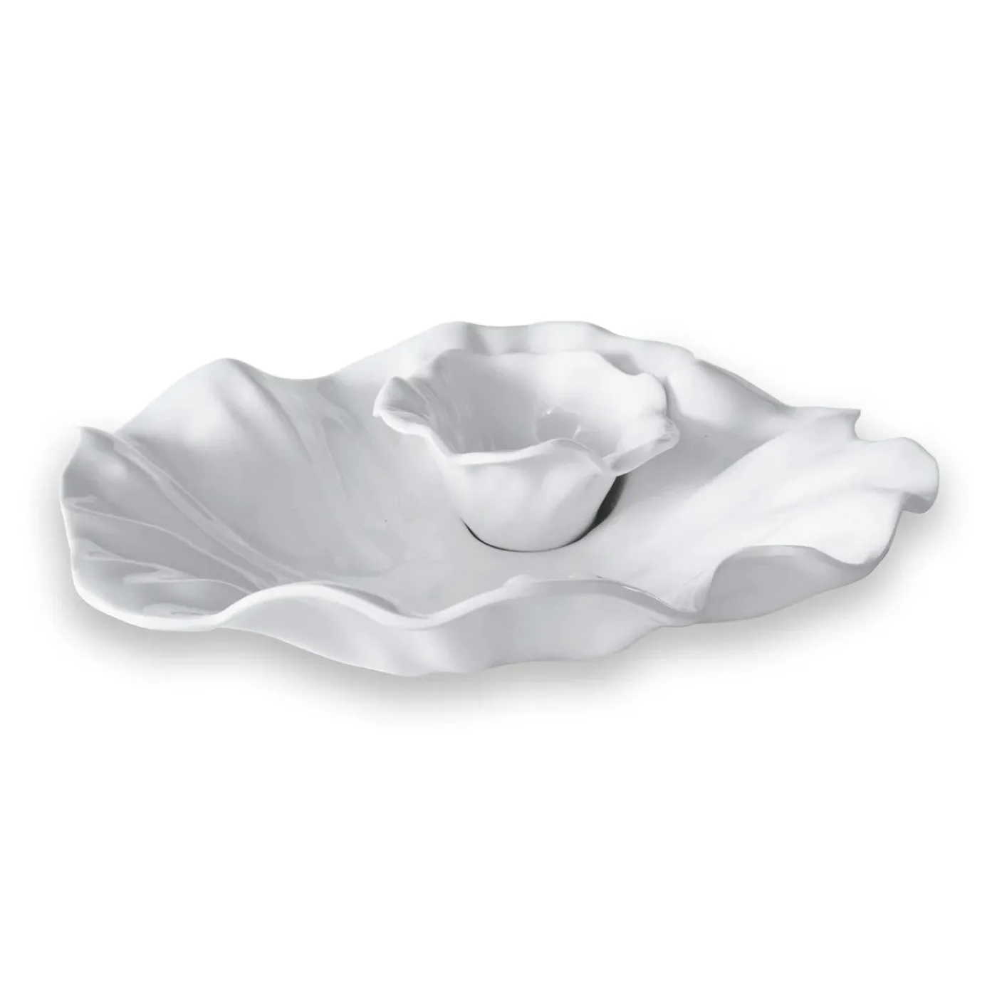 As with the other Bloom pieces, the dynamic design of the two-part VIDA Bloom Chip and Dip (White) in luxury melamine features rippling petal-like movement, creating an eye-catching serving piece that combines beauty, artistry and functionality. Great on its own, or combined with other Bloom shapes and sizes, this handsome chip and dip will be the life of the party.