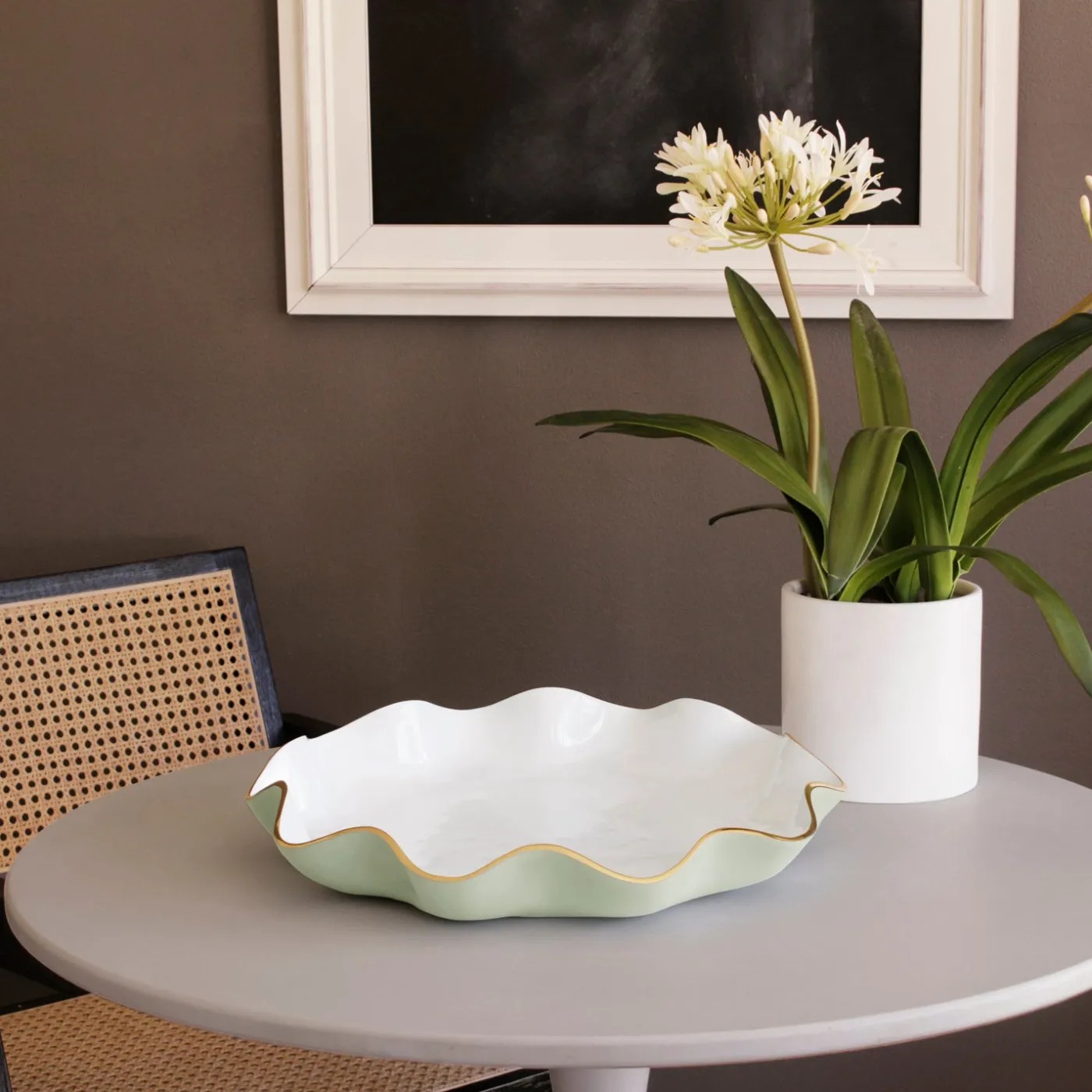 Notable for its flirty curves, generous serving area, and brilliant two-tone finish rimmed in gold, the ENCANTO Carola Large Round Platter (Pistachio and White) is as practical as it is decorative. Presented in Pistachio and White, a warm pale green that evokes freshness, renewal, and growth. Ideal for the coffee table, the bar, or the kitchen island. Use for appetizers, desserts, meat, salad or for display. A distinctive serving piece and a thoughtful gift for weddings, bridal registries, or housewarmings.