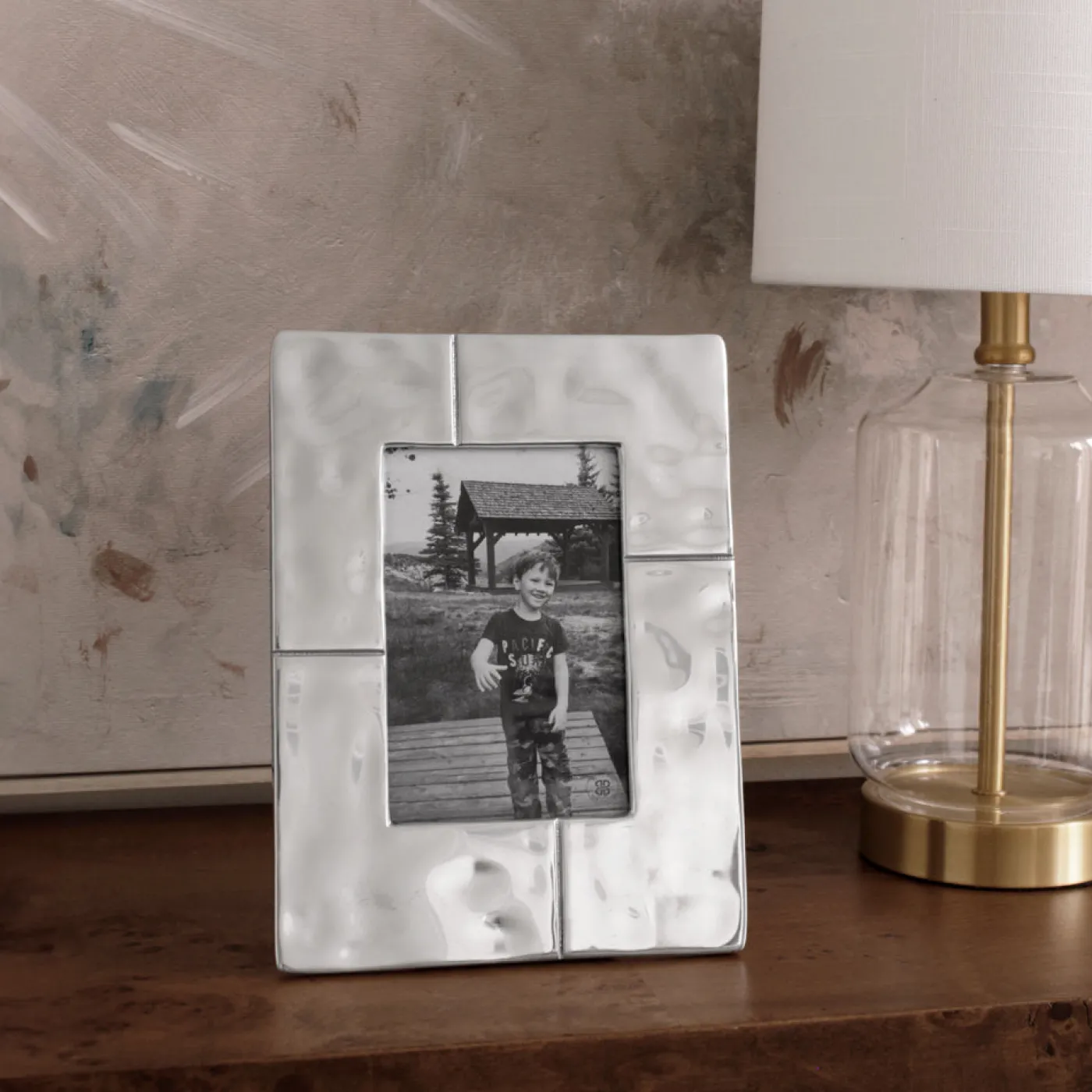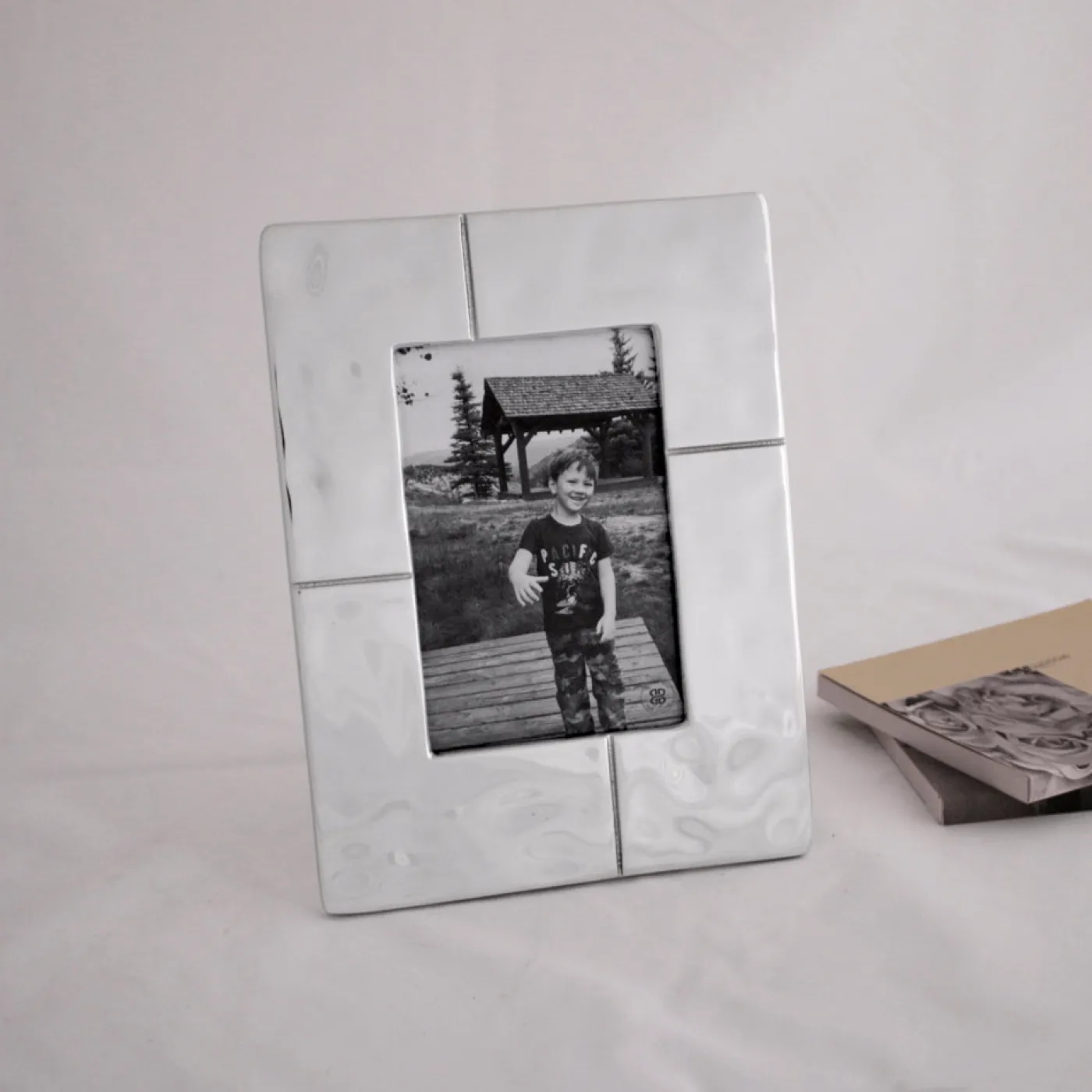 Pure brilliance! With its silvery finish and asymmetrical pattern of grooves, the FRAME Asimetric 4 x 6 Vertical of polished metal enhances your favorite 4×6 vertical photo, and looks amazing when displayed on the mantle, desk, or shelf. Composed of a gleaming hand-finished silvery metal that keeps its shine and never needs polishing, the frame has been designed to stand vertically without the aid of support. The frame makes a fine wedding gift–or for any special occasion–and is an elegant solution whenever a metal frame is called for. Beatriz Ball’s intensely handmade products employ eco-friendly and sustainable materials and are crafted by artisans who trace a heritage of metalworking for generations. An original Beatriz Ball design, sustainably handmade of a top quality, easy-care, aluminum alloy. Tarnish free.