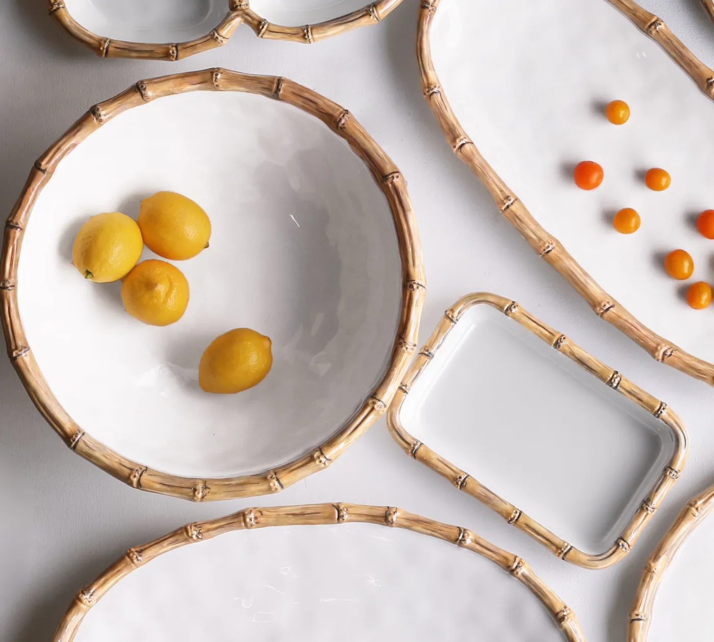 The VIDA Bamboo Large Salad Bowl (White and Natural), an essential item from Beatriz Ball’s VIDA Collection of luxury melamine, is the result of a collaboration with noted illustrator, August Wren. With a bamboo inspired rim and a brilliant white surface, the stylish and generous bowl works well with our VIDA Bamboo dining sets, serving pieces and flatware. Create a table with a carefree and classy Beatriz Ball twist! It looks great when sharing a table with GARDEN Bamboo items from our signature metal line too. Perfect for a variety of serving needs, the bowl has the luster, heft and look of a ceramic piece.
