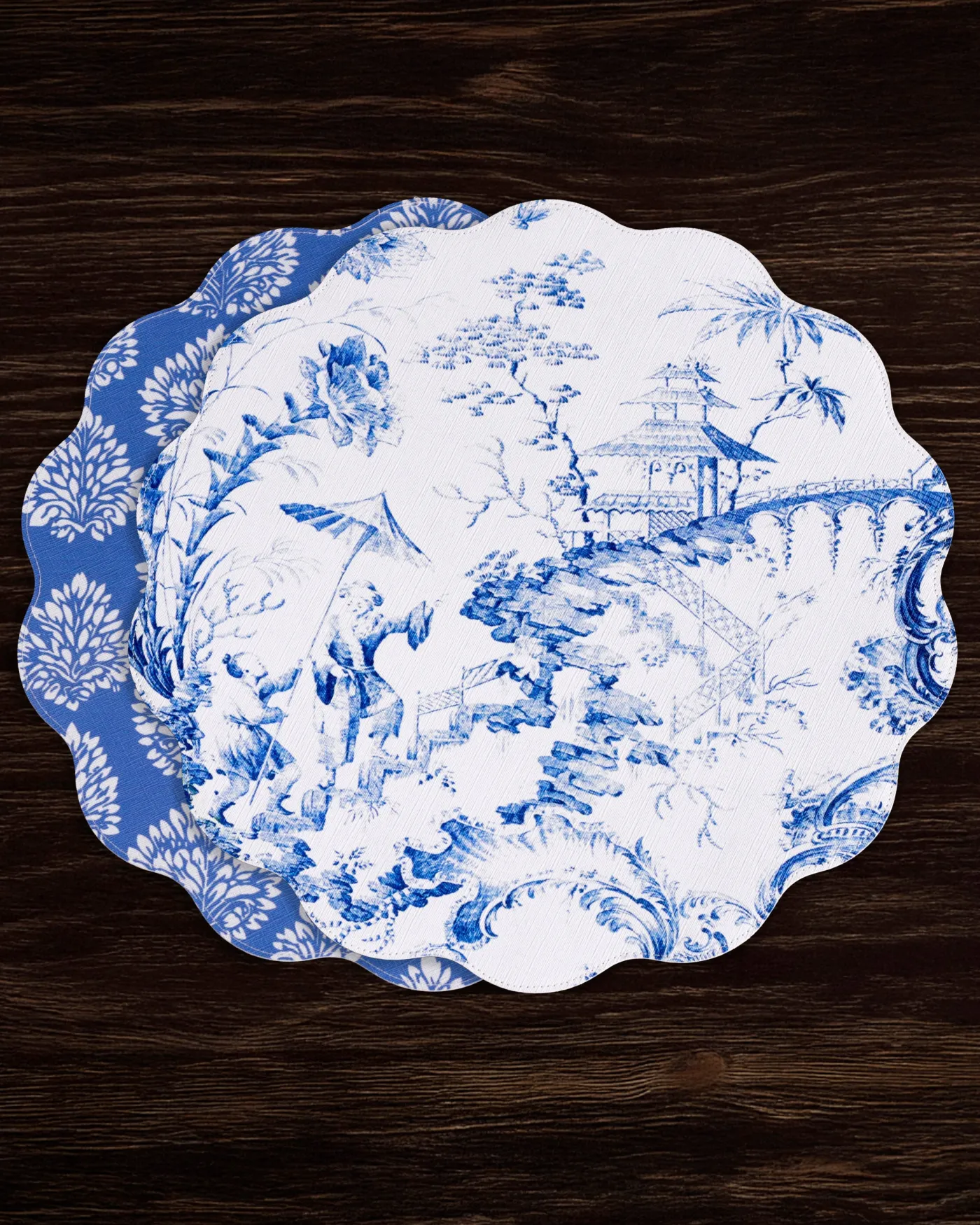 Two looks in one timeless design. The VIDA Chinoiserie Reversible Round Placemats in blue & white have a supple leather-like feel and linen texture. One side features a classic Chinoiserie motif with Asian figures, foliage, and a pagoda; the reverse shows a stylized floral pattern.