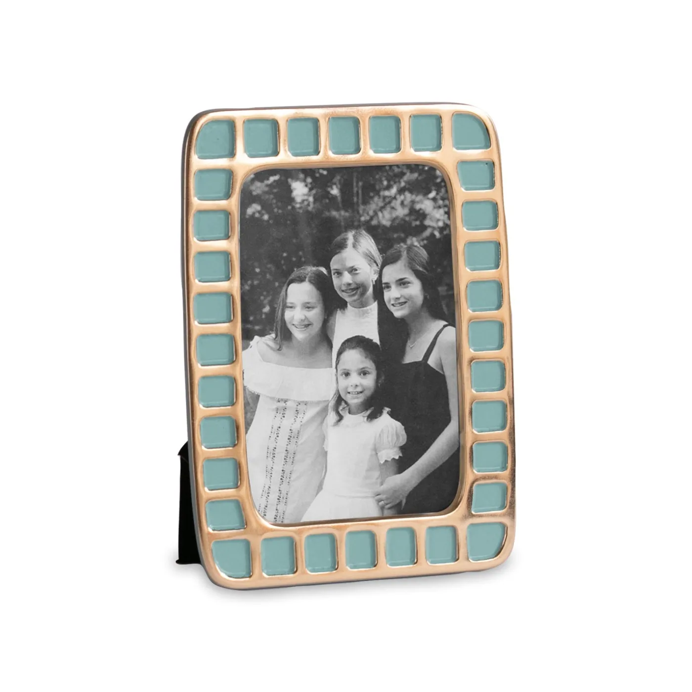 Beatriz Ball’s ENCANTO Mosaic Giftables Frame 4″x 6″ (Turquoise) is the very essence of sophisticated contemporary design, strikingly presented in colorfully enameled metal, rimmed in gold.