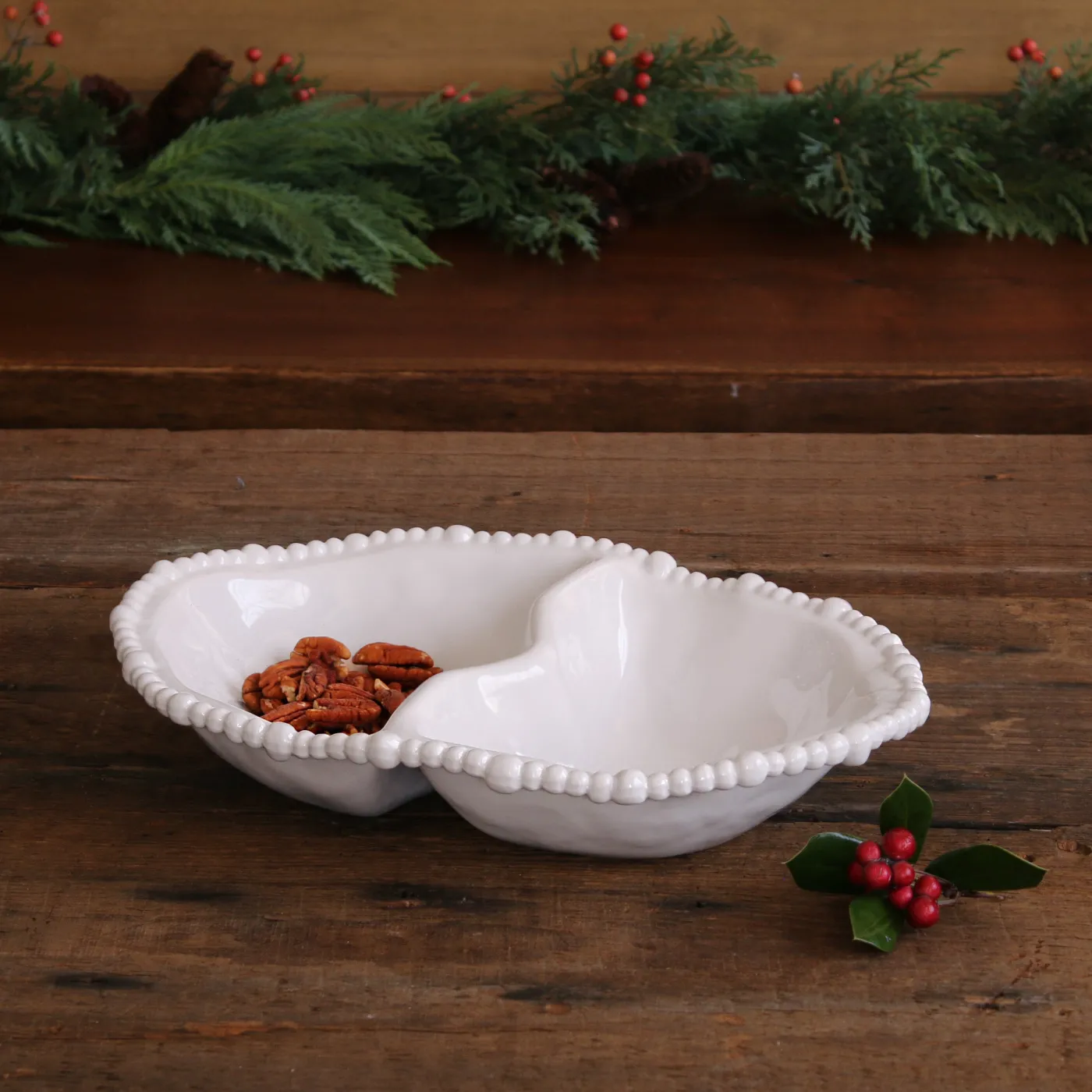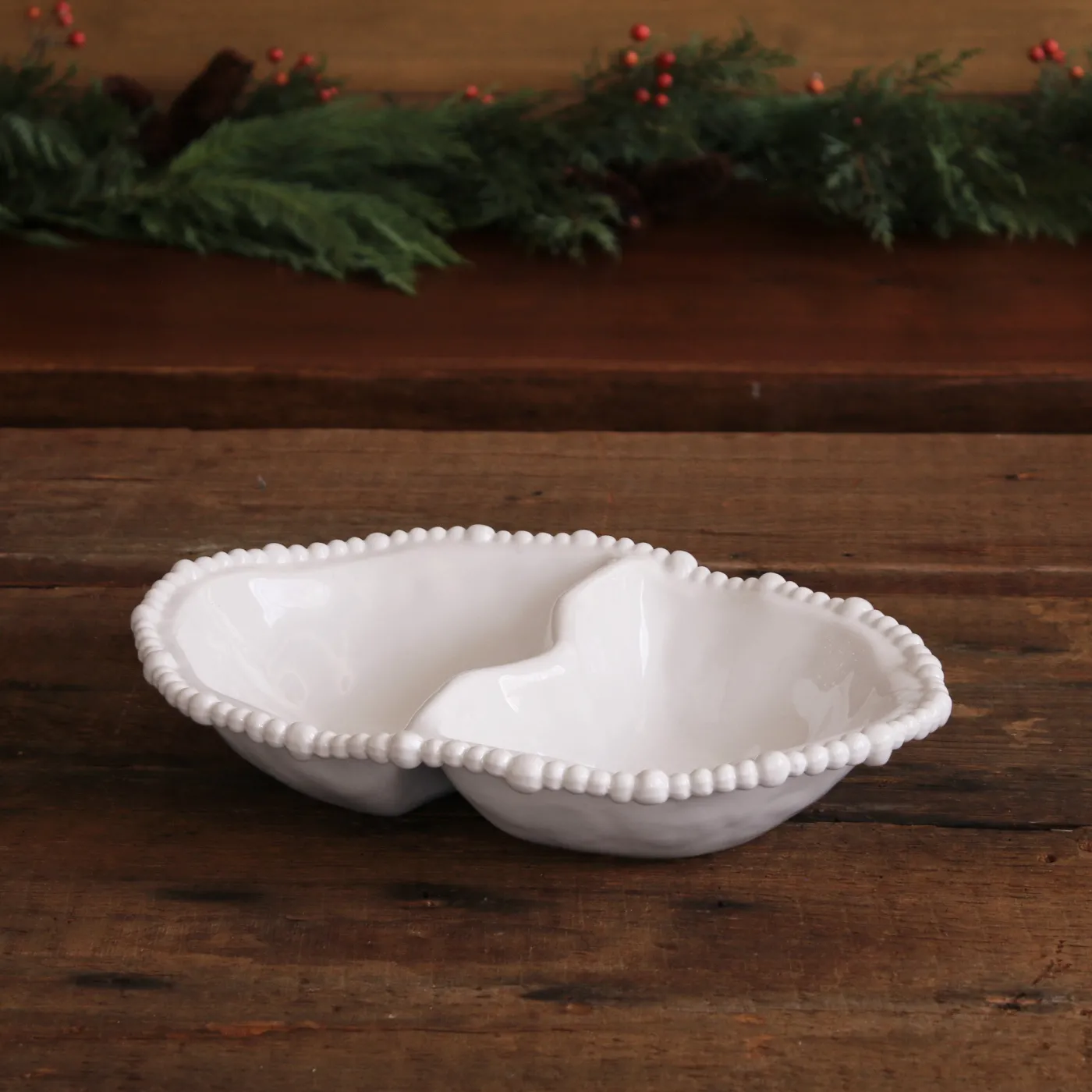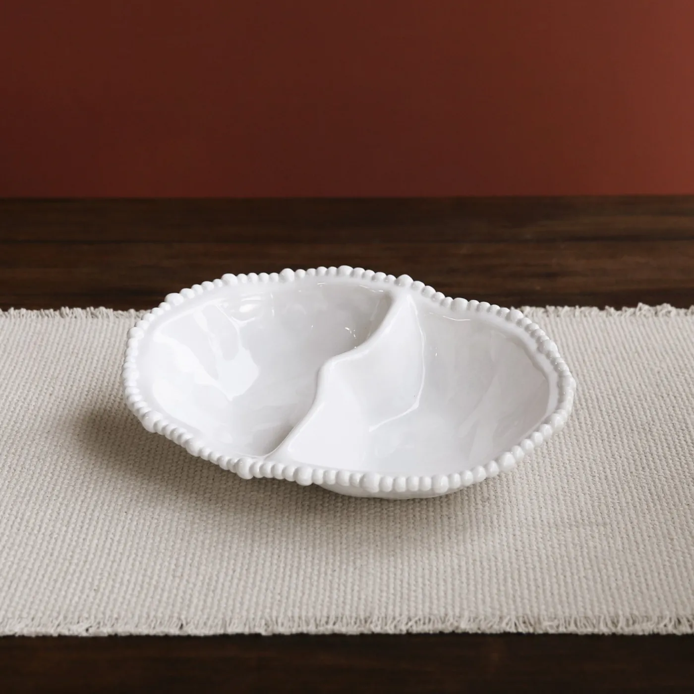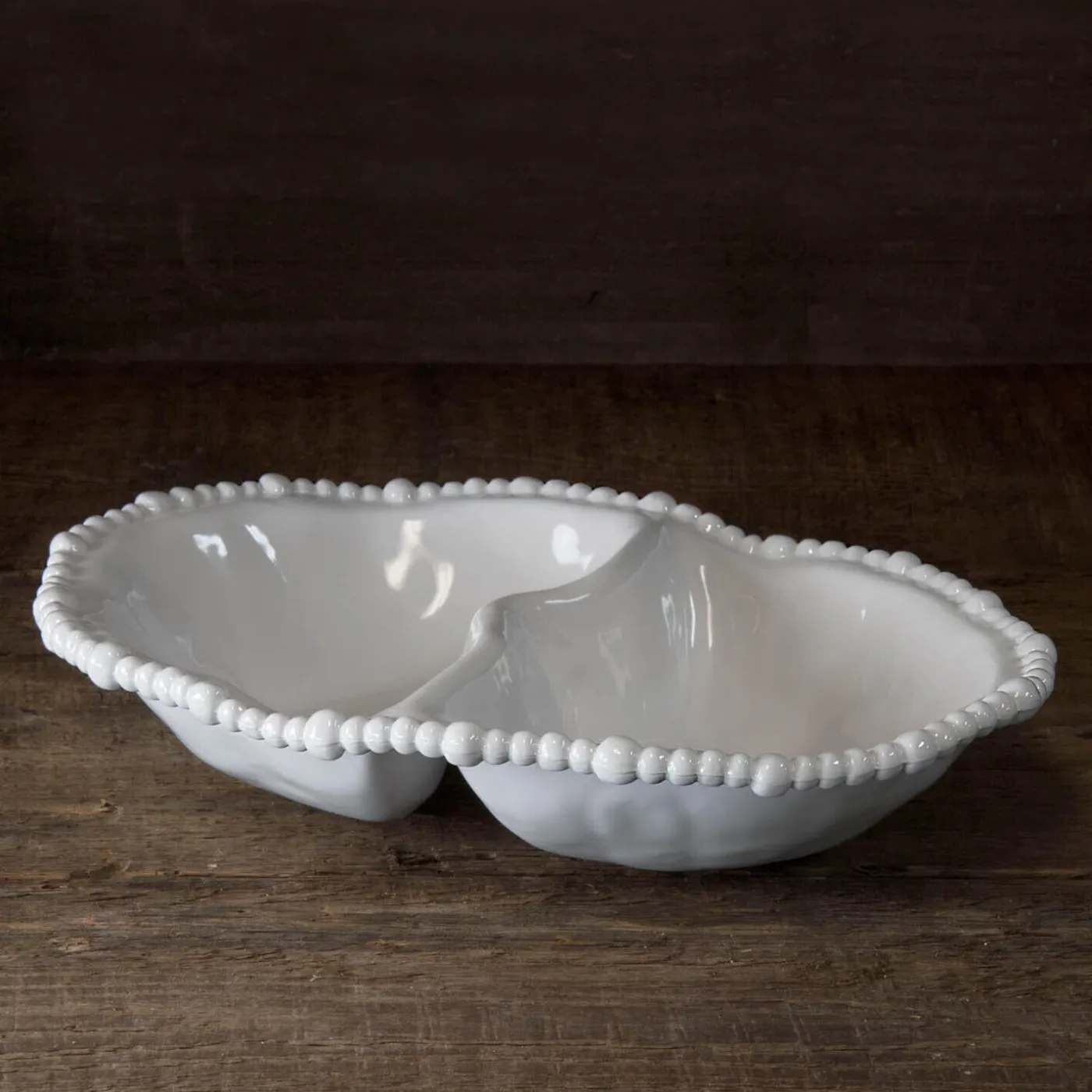 Luxury melamine–split personality. When just one dip won’t do, use the Beatriz Ball VIDA Alegria Double Dip (White) to bring complementary dishes together. Salsa and guacamole harmonize; green beans and roasted new potatoes come together. Surrounded with a rim of pearls, the versatile piece makes a great gift for anyone who loves to entertain. Great for passing around chips and dip, the piece also makes a stylish statement on the dining or patio table. Perfectly suited for indoor and outdoor entertainment, the Alegria Double Dip is designed for everyday enjoyment. Pair the tray with other white melamine pieces for a coordinated serving set, and a festive and vibrant table display. The multipurpose piece works beautifully with items from Beatriz Ball’s signature metal line, too. Having the substance, weight and appearance of ceramics, this white melamine serving piece is as beautiful as it is versatile. Dishwasher safe (top rack), heavy-weight, food safe, BPA and PABA free.