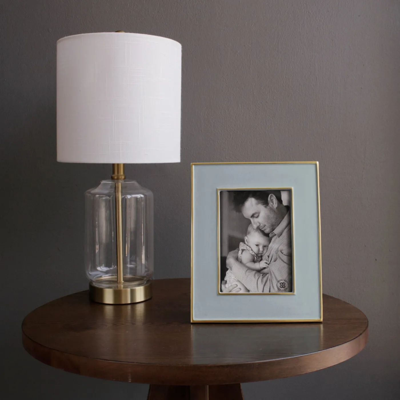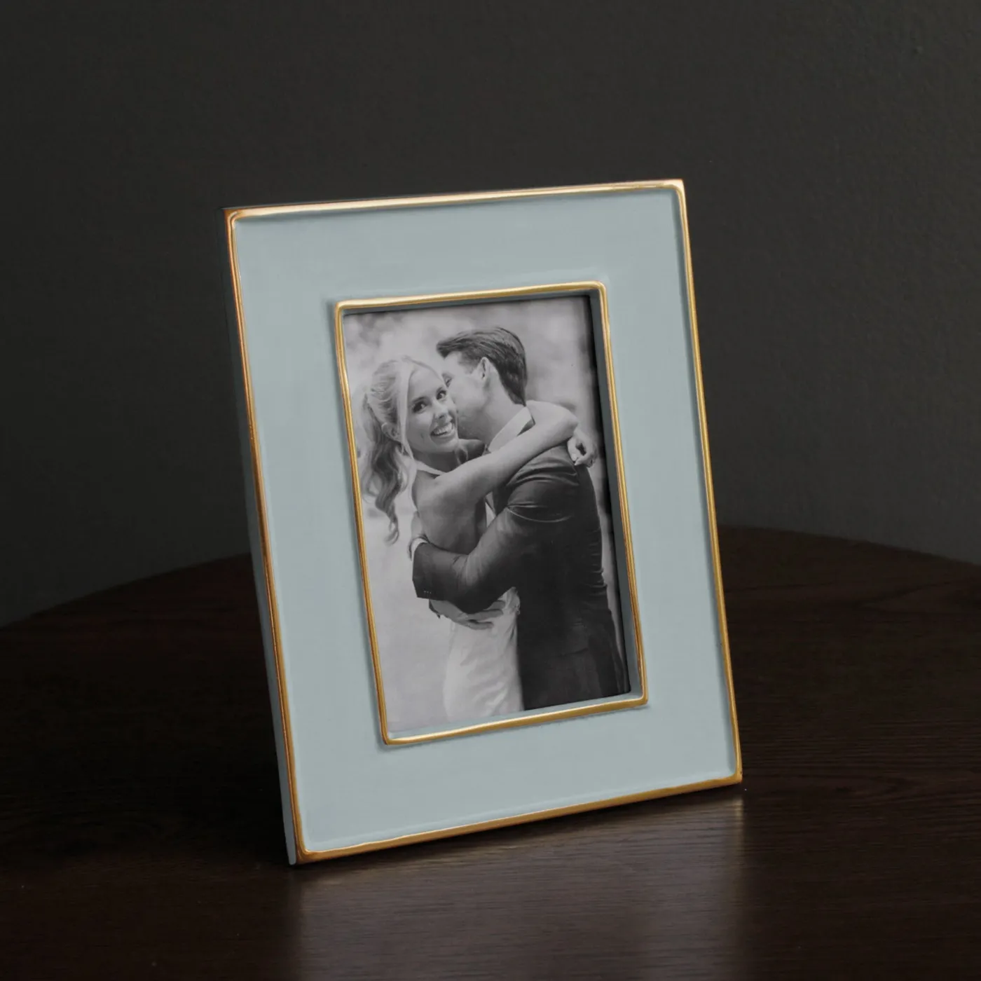 Classic in Slate. The Encanto Jason Frame 5 x 7 (Slate) pairs a wide rectangular profile with glossy enamel, luminous gold accents, and timeless styling. Ideal for displaying a special 5×7 photo, it also makes a refined decorative accent in any room. The Slate shade—a calm, slate-inflected neutral blue—adds depth and versatile sophistication. A superb gift for brides, bridal registries, weddings, or new homeowners. Also, a great gift for men.