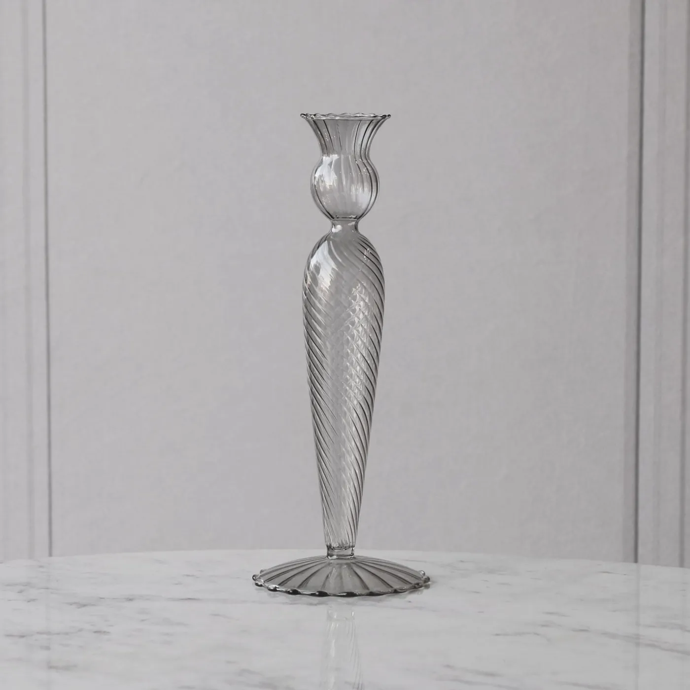 Vintage vibe at a great price point. Beatriz Ball celebrates the art of glassmaking with the luxurious GLASS Cambridge Collection. Vibrantly classic, the GLASS Cambridge Vienna Small Candlestick Holder Set of 2 (Light Gray) has a spun sugar delicacy, and a jewel-like sheen and clarity. Guaranteed to add life to any room, the candlestick holders can be topped with tapers in fun colors, and mixed and matched with other Cambridge designs of various hues and sizes–including the large Vienna. Cross-merchandise with your favorite candle line. A great addition to your store, the candlestick holders are sold as a set of two. Made exclusively for Beatriz Ball. Handwash.
