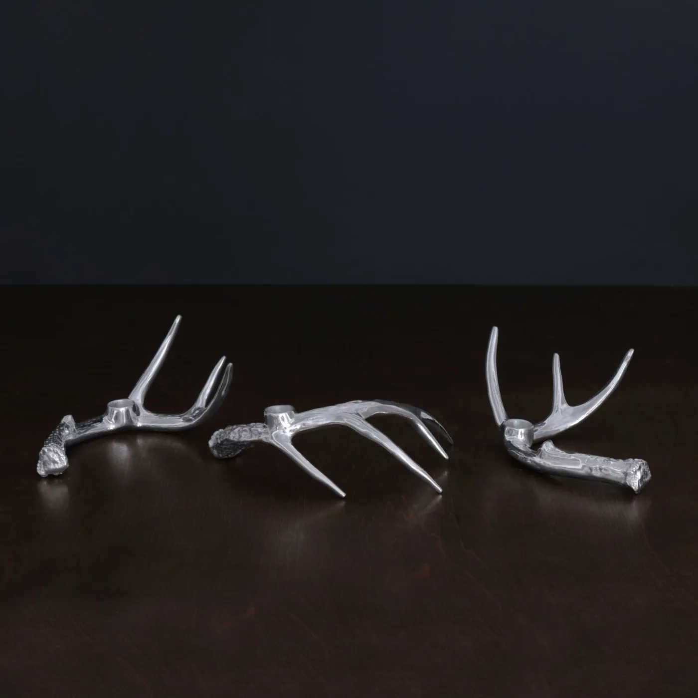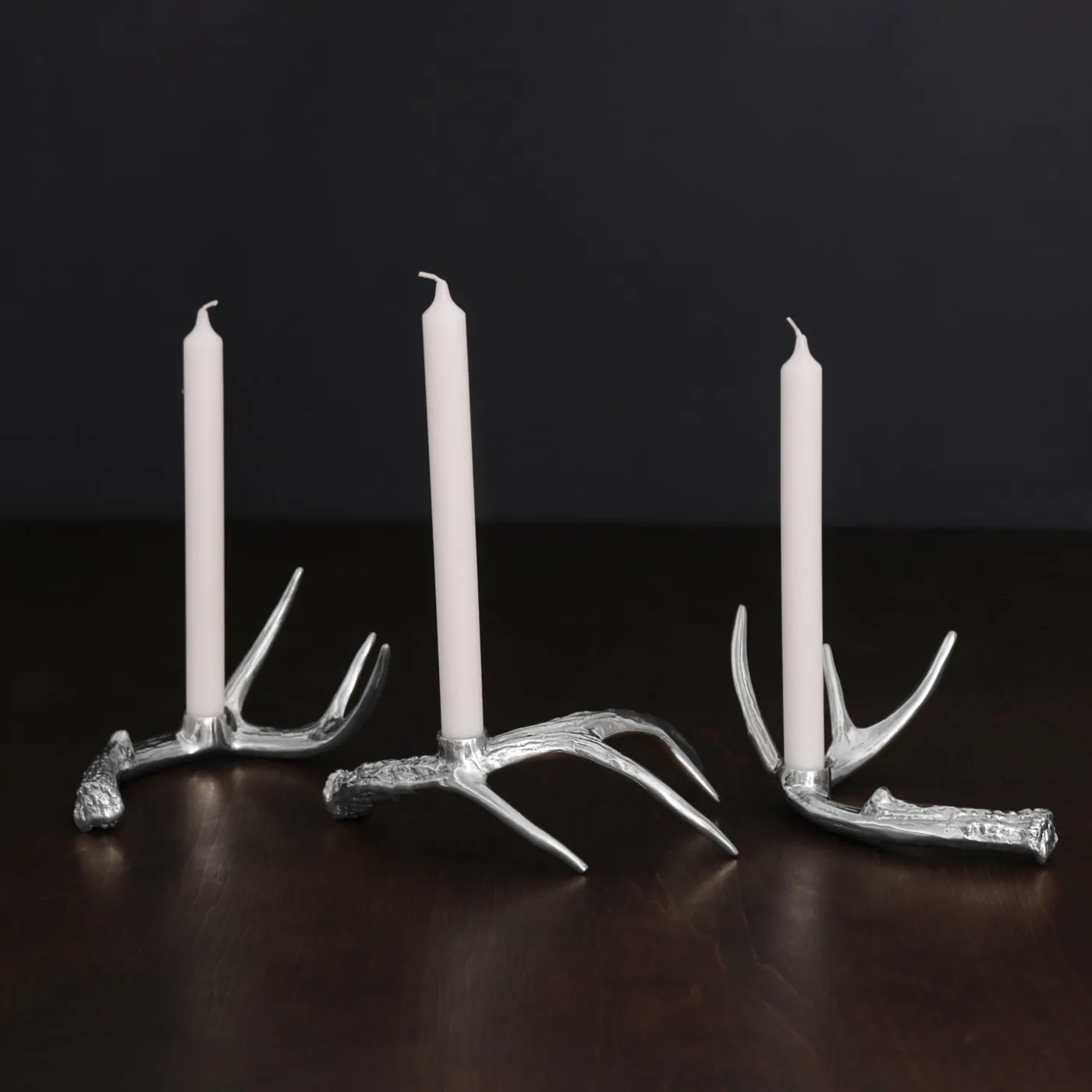 Crafted by skilled artisans in our signature metal, the WESTERN Antler Candlestick Set of 3 really pushes the limits of the art of sand-casting. The innovative designs are characterized by elegant interlocking natural forms that incorporate a sense of expression and dynamic movement. Sinuous and supple, the trio of curving antler-inspired candle holders makes a sculptural statement wherever they are placed.